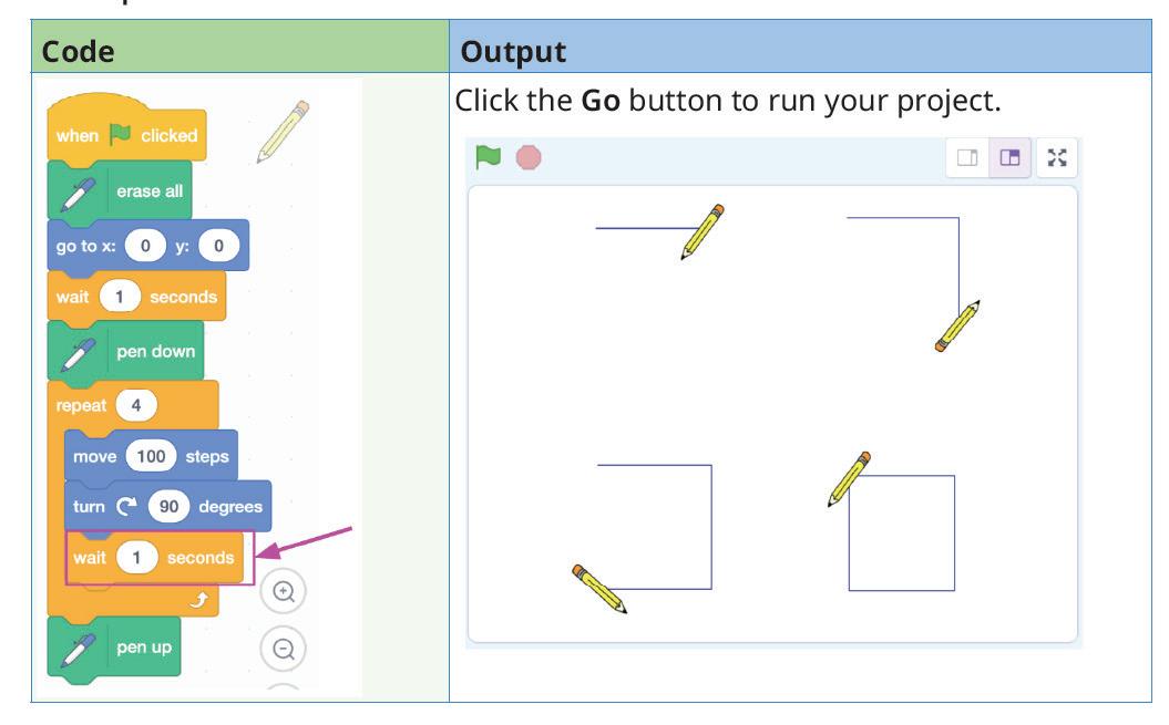 4 To add a pause or delay in a sequence of actions, you can use the 'wait' block.