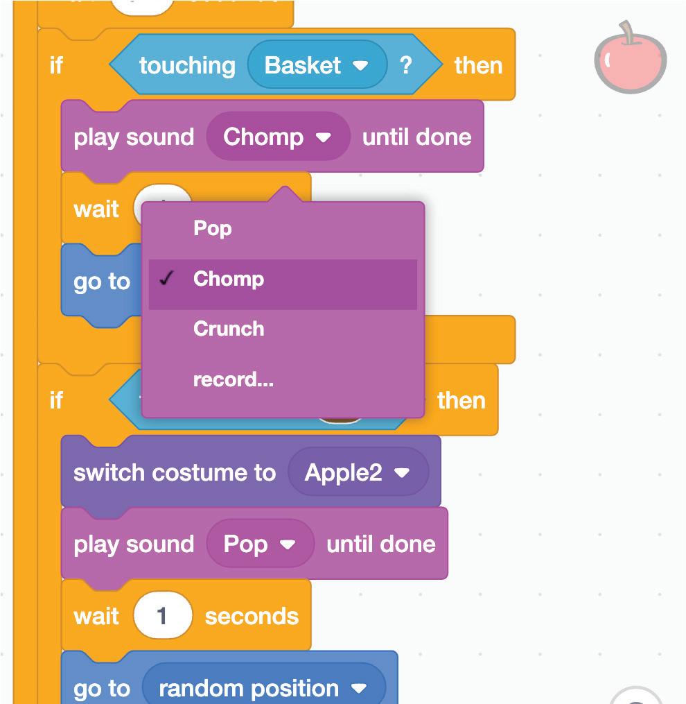 12 Change the sound to Chomp in the play sound block in the if touching Basket? block.