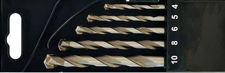 Conjunto de brocas de widia en estuche plástico compuesto por 5 piezas de 4 a 10 mm. Fabricación según norma DIN 8039. Cuerpo fresado. Plaquita de carburo de alto rendimiento. Utilice el taladro en percusión. Nunca debe ser utilizada para taladrar metales.