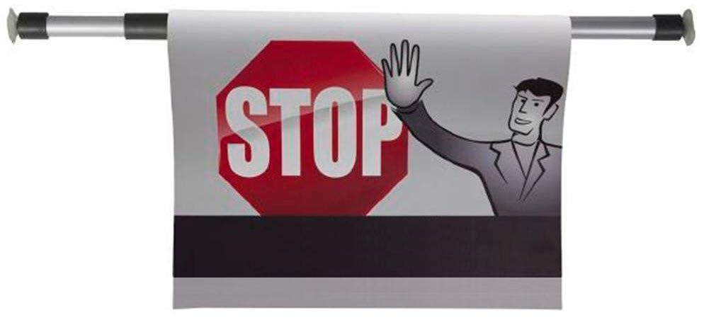 Rótulo de advertencia para colgar en lona plástica impresa para clausura de áreas (por ejemplo aseos). Gracias al mecanismo telescópico, son aptas para anchos de puerta de 76 a 133 cm. Las ventosas en los extremos protegen los marcos y las hacen resistentes.