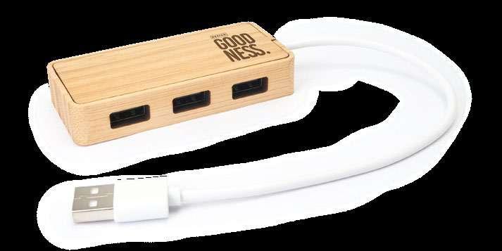 USB port with body in natural bamboo and white cable. 3 in-built USB ports. Presentation in eco design box.