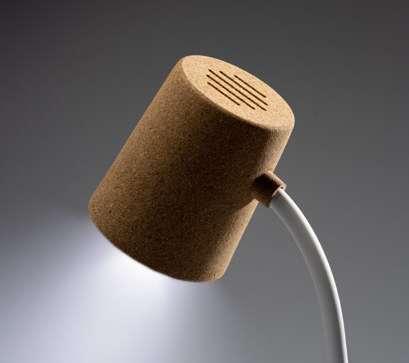 Table lamp with details in cork, with in-built 10W wireless charger on the base and 3W wireless speaker. LED light with three lightning modes. Presentation in eco design box.