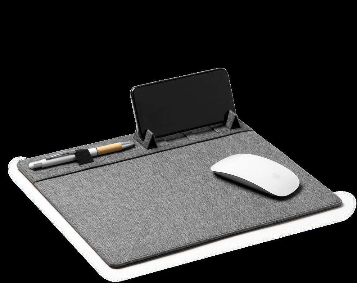 Mouse pad with in-built wireless charger. Soft foldable surface in natural cork with non-slip base. DC5V. Cable included. Presentation in eco design box.