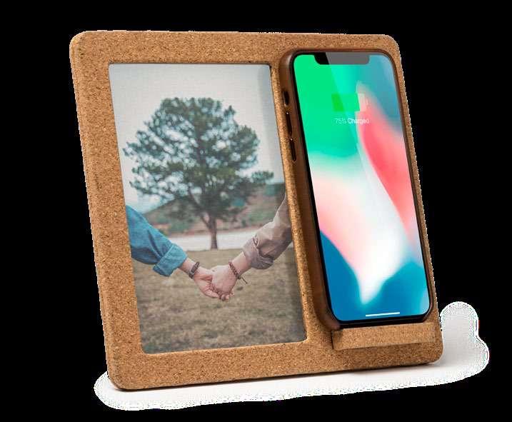 Wireless charger with photo frame made of cork. Ideal for 10 x 15 cm pictures. Compatible with wireless technology devices. 10 W. Cable included. Presentation in eco design box.