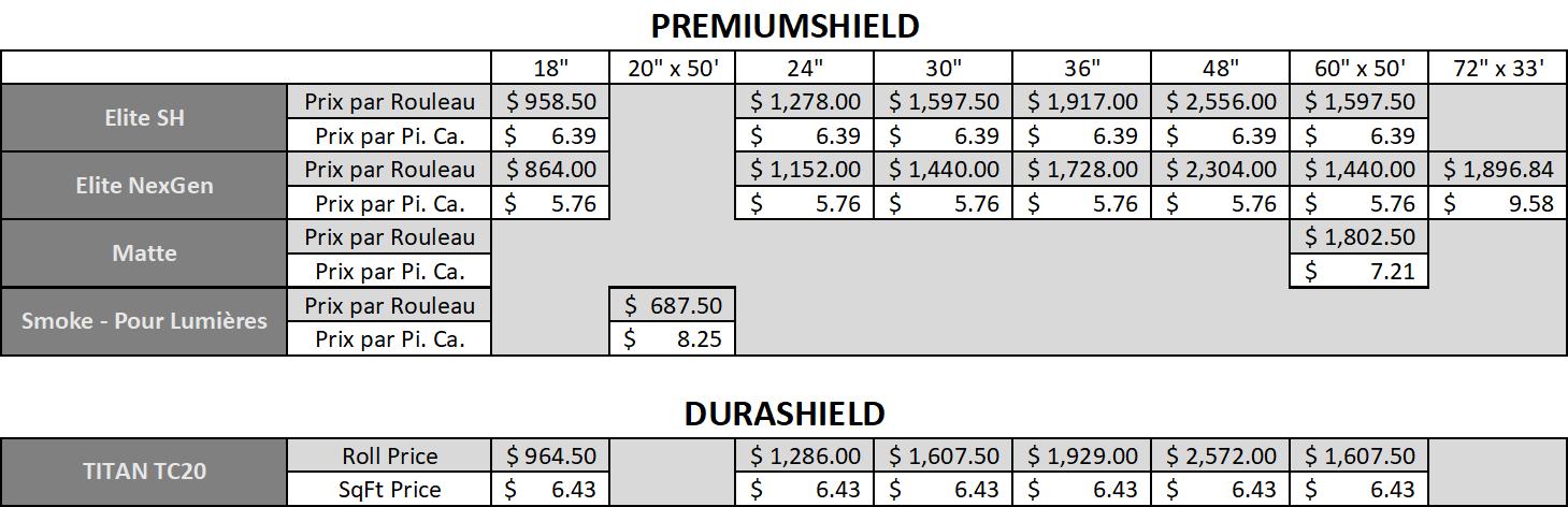 • Toutes les pellicules sont disponibles en longueur de 5’ (sauf Clear Shield 14, qui est disponible seulement en rouleau complet)