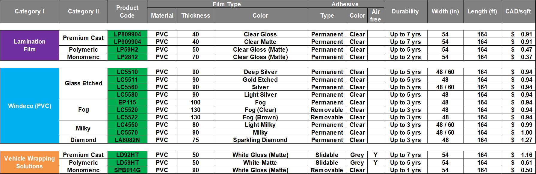 •Sign and Graphics films available by the foot, minimum order of 5’