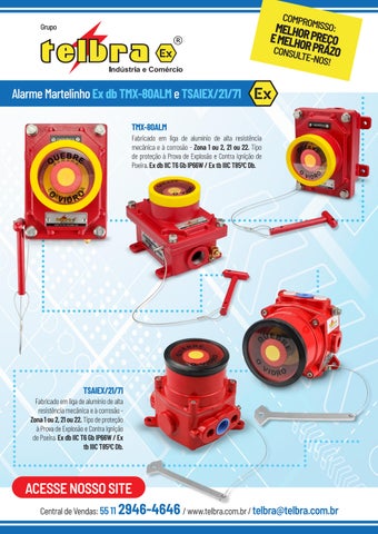 Central de Vendas: 55 11 2946-4646 / www.telbra.com.br / telbra@telbra.com.br INDÚSTRIA 100%NACIONAL PRONTA ENTREGA! CONSULTE-NOS Materiais elétricos para atmosfera explosiva O GRUPO TELBRA investe pesado numa LOGÍSTICA DE DISTRIBUIÇÃO BEM DEFINIDA e uma gestão de estoque inteligente PARA ATENDER RAPIDAMENTE TODOS OS PEDIDOS DE NOSSO CLIENTES. Conduletes IP66/IP66W Tubo Flexível Ex TTFX Unidades Seladoras Ex d TUSX/VH Conexões com Normas ABNT NBR e IEC Painéis Ex Conduletes Ex d/ Ex t/IP66 ACESSE NOSSO SITE