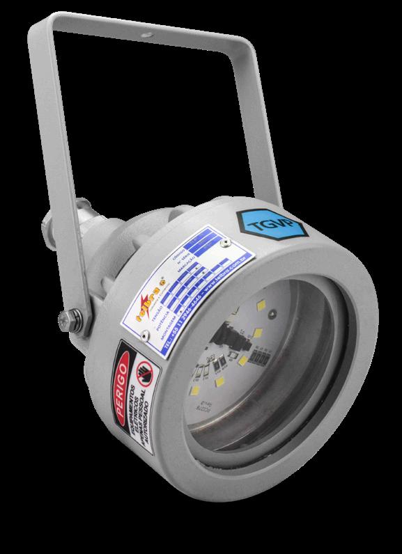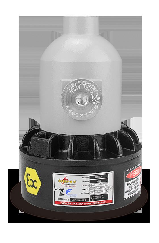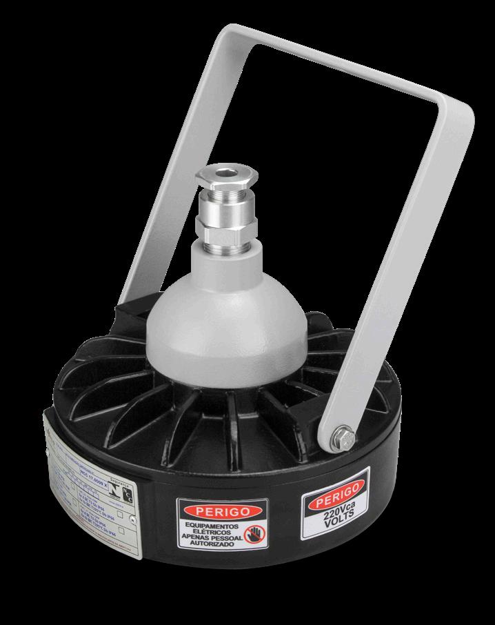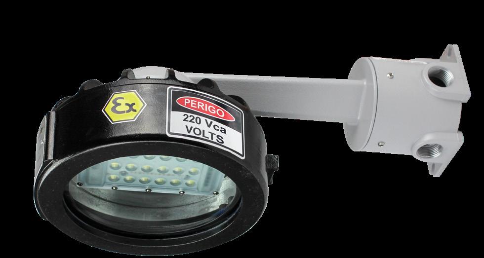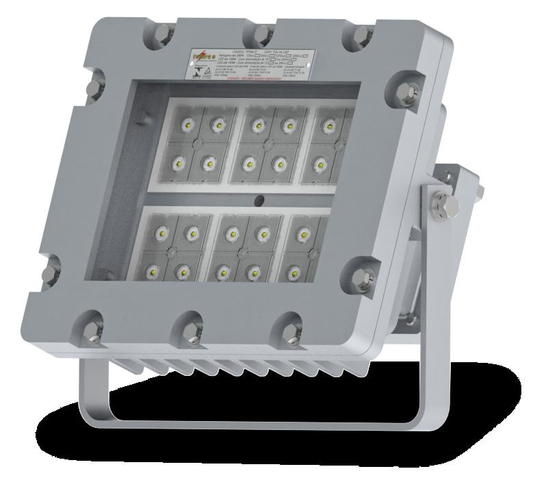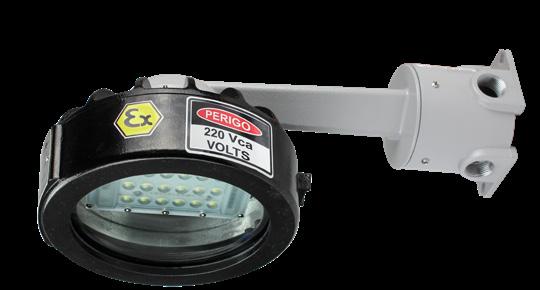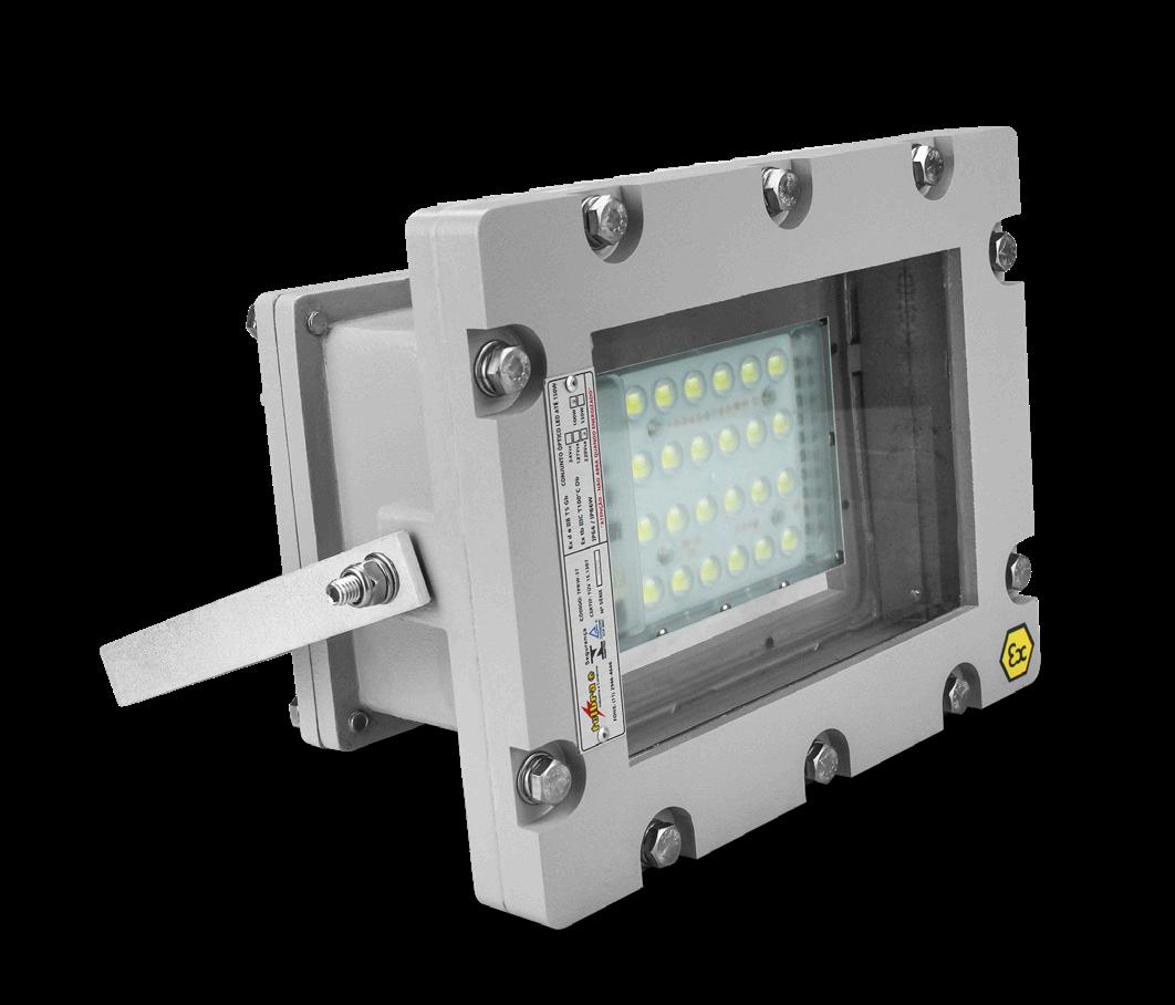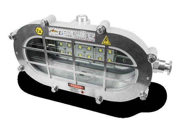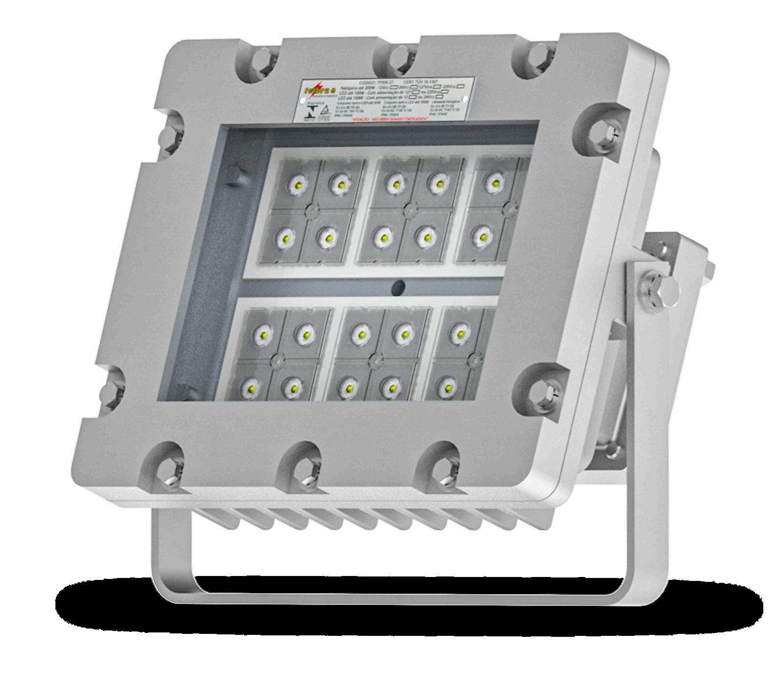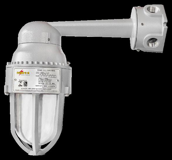 Luminária adequada para instalações em áreas classificadas com o tipo de proteção à prova de explosão Ex db e à prova de ingresso de poeiras Ex tb. Corpo fabricado em liga de alumínio fundido, de alta resistência mecânica e à corrosão, SAE 305 ou SAE 356. Vidro plano temperado, acabamento em pintura eletrostática texturizada na cor cinza claro Munsell N6.5.