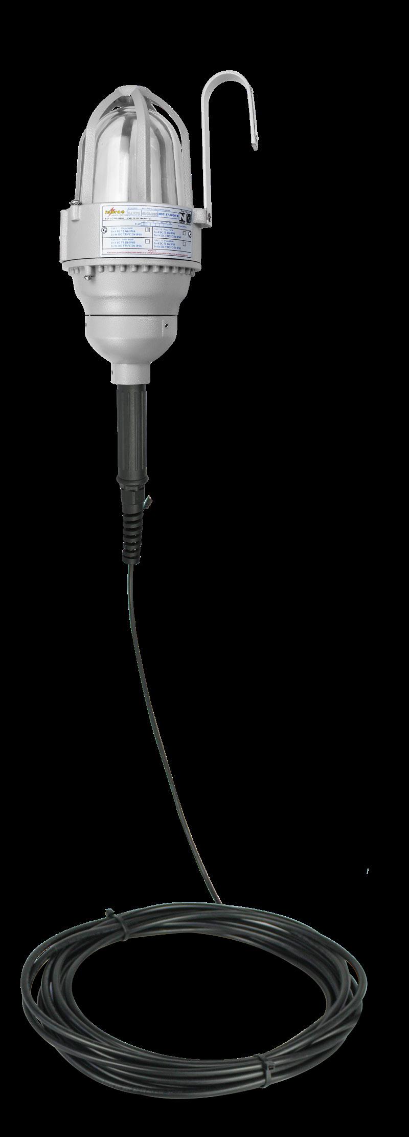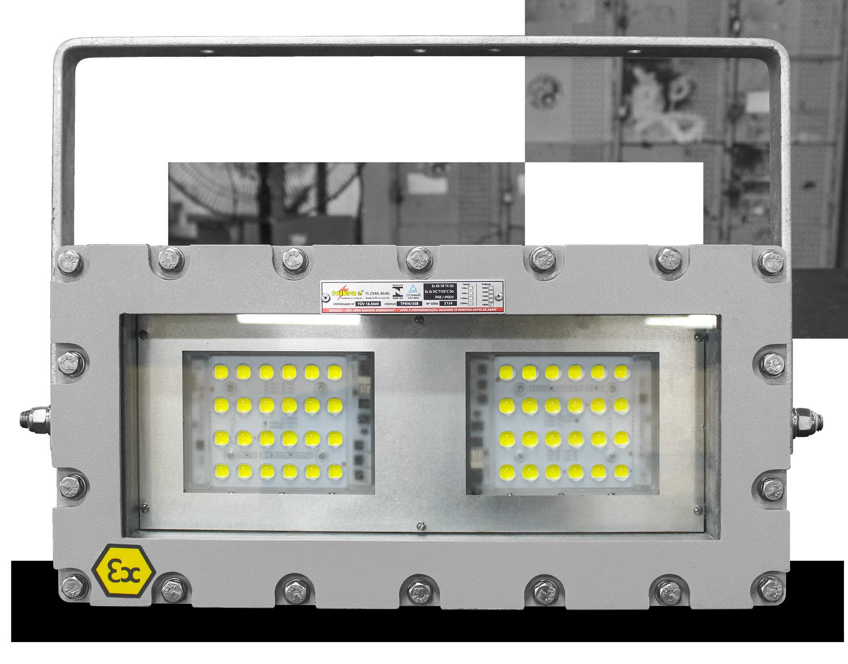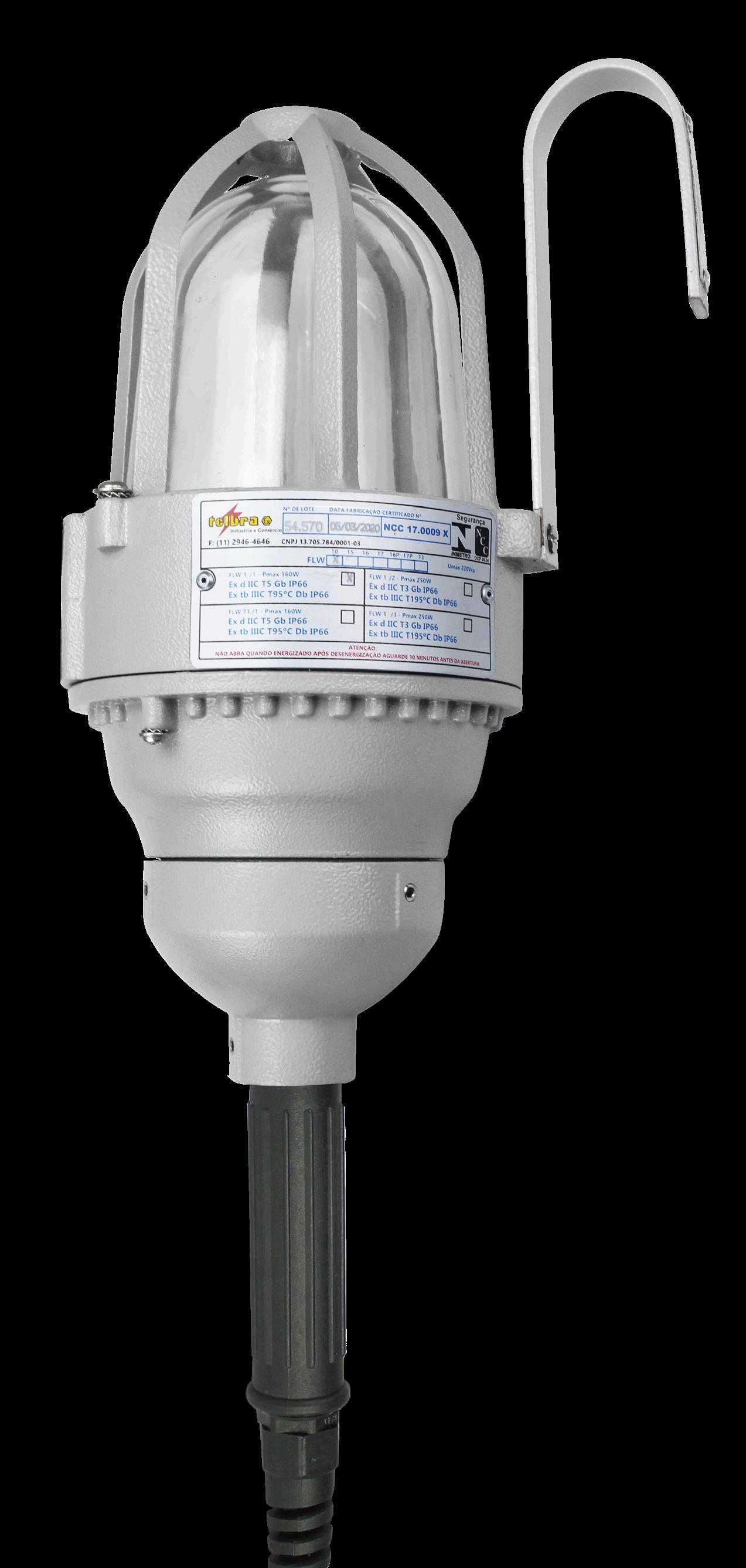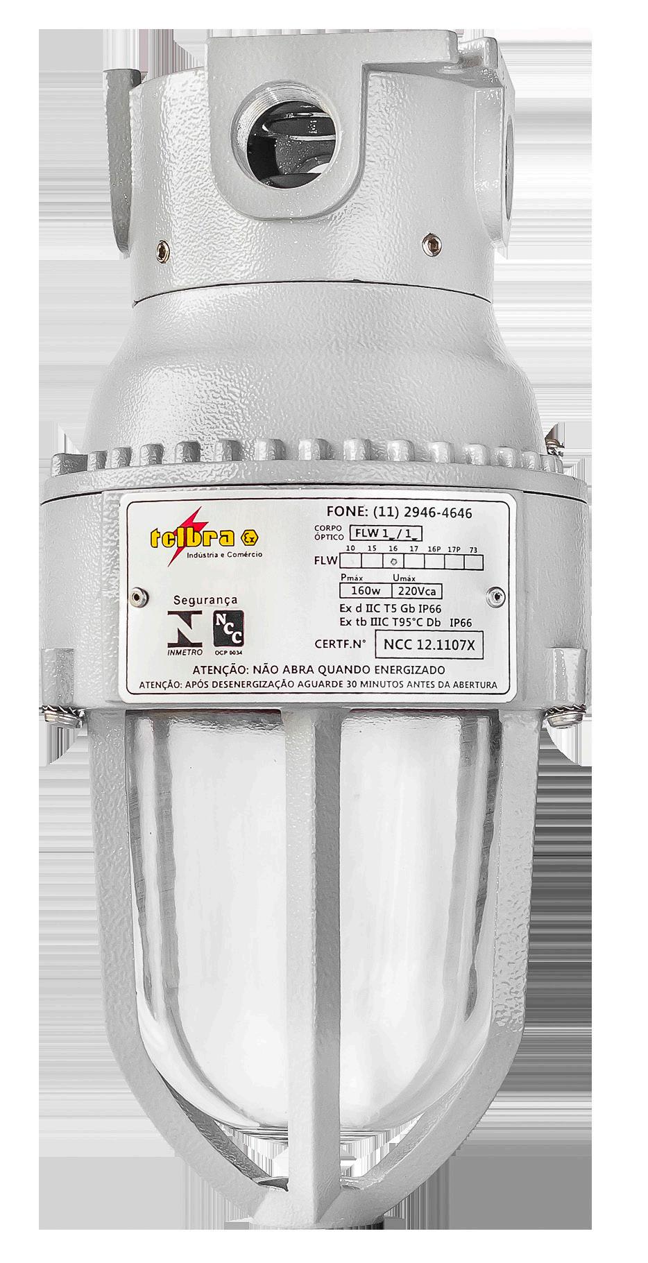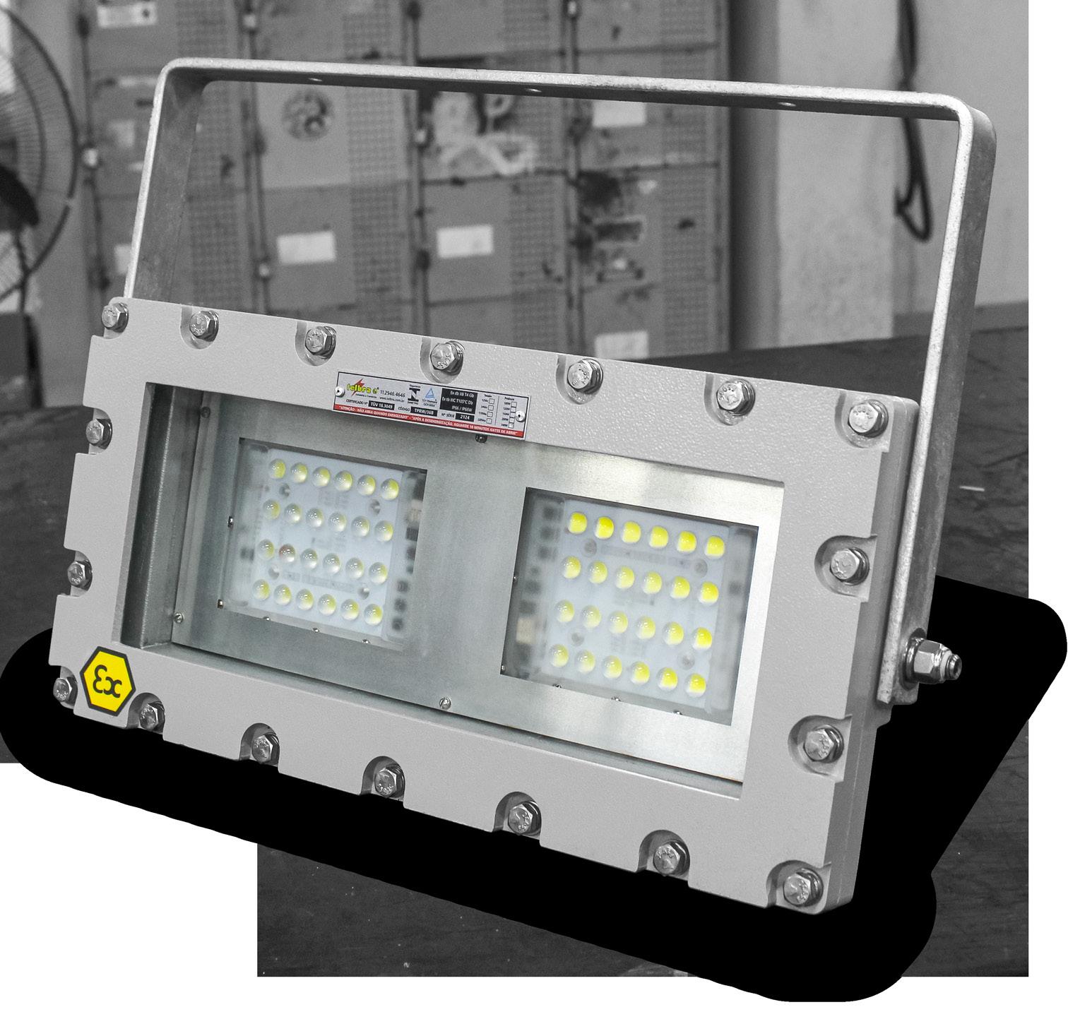Luminária adequada para instalações em áreas classificadas com o tipo de proteção à prova de explosão Ex db e à prova de ingresso de poeiras Ex tb. Corpo fabricado em liga de alumínio fundido, de alta resistência mecânica e à corrosão, SAE 305 ou SAE 356. Vidro plano temperado, acabamento em pintura eletrostática texturizada na cor cinza claro Munsell N6.5.