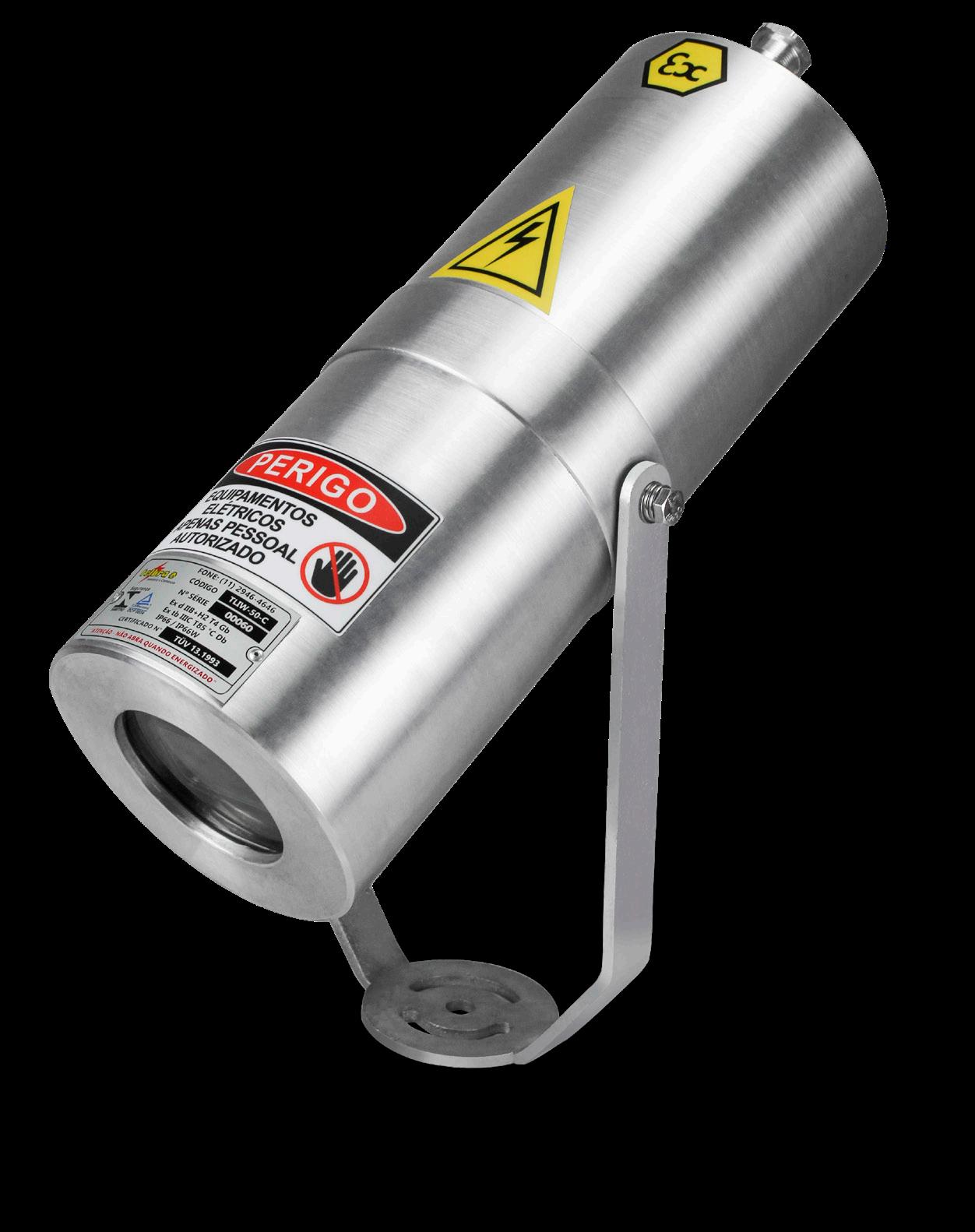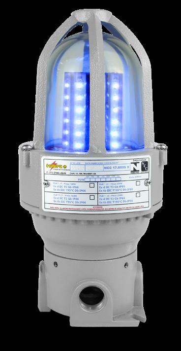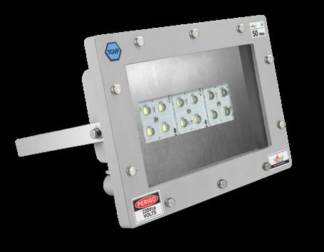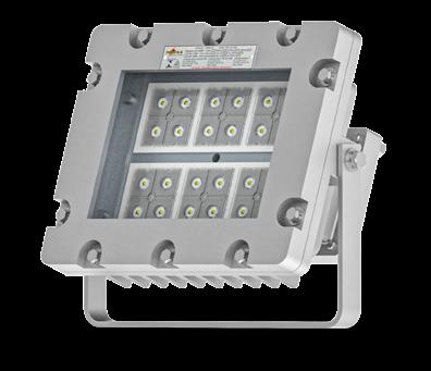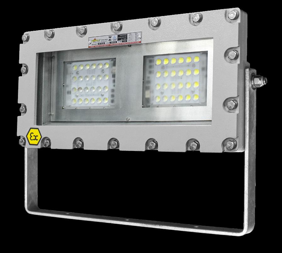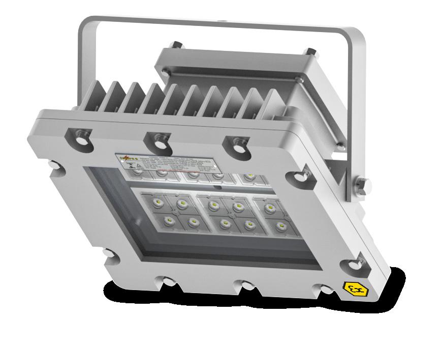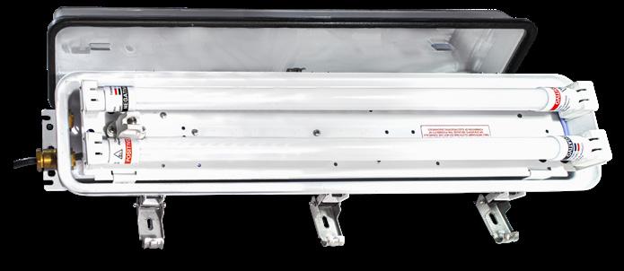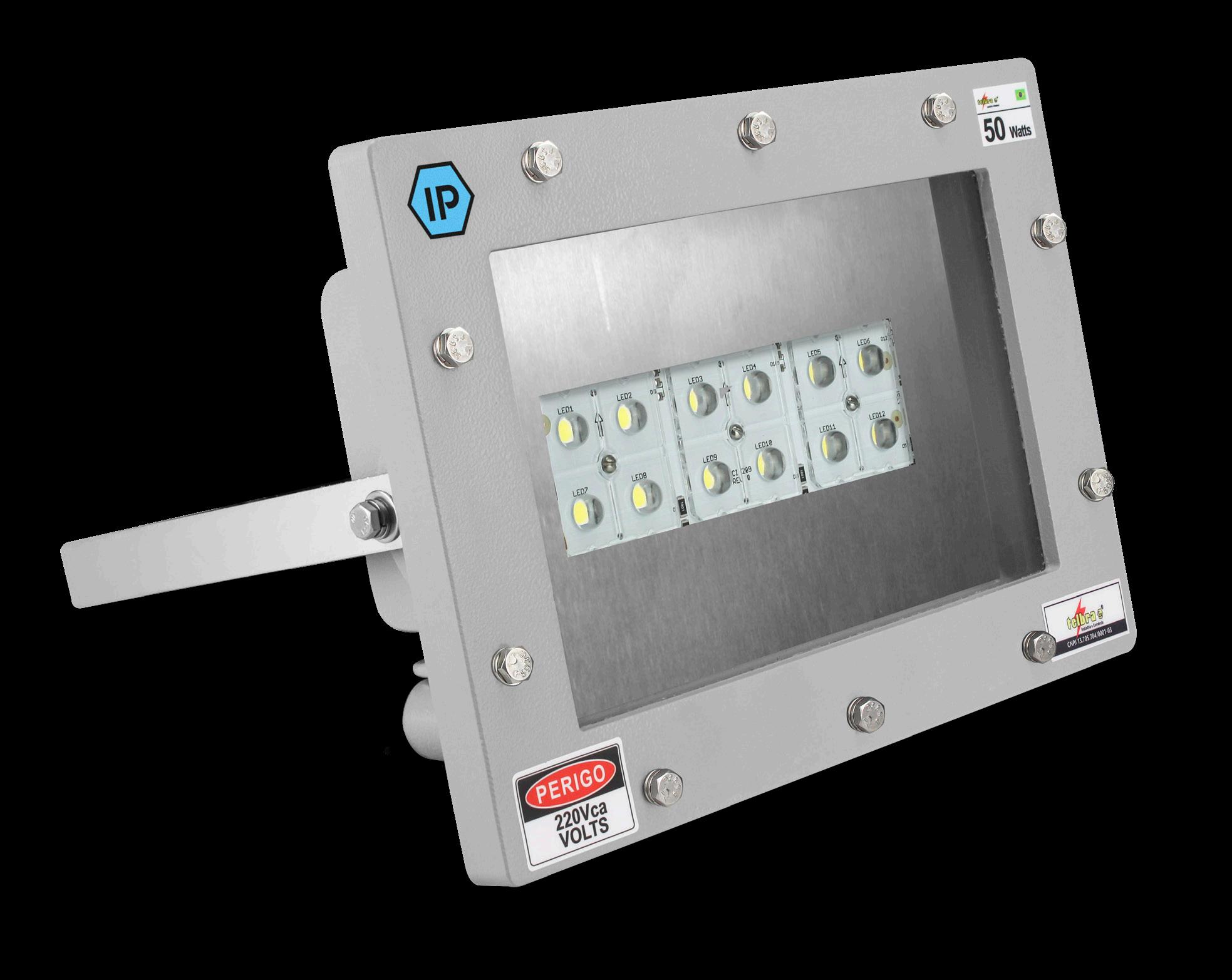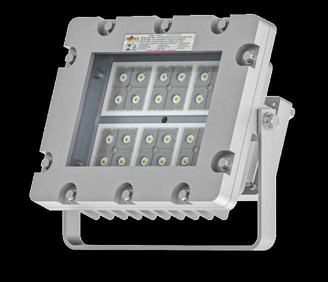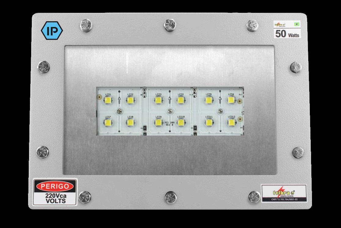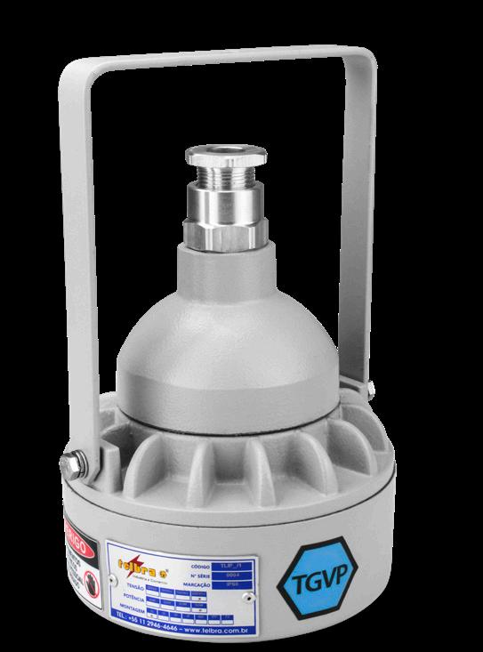 Luminária adequada para instalações em áreas classificadas com o tipo de proteção à prova de explosão Ex db e à prova de ingresso de poeiras Ex tb. Corpo fabricado em liga de alumínio fundido, de alta resistência mecânica e à corrosão, SAE 305 ou SAE 356. Vidro plano temperado, acabamento em pintura eletrostática texturizada na cor cinza claro Munsell N6.5.