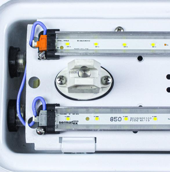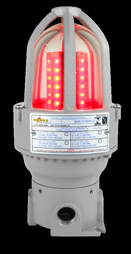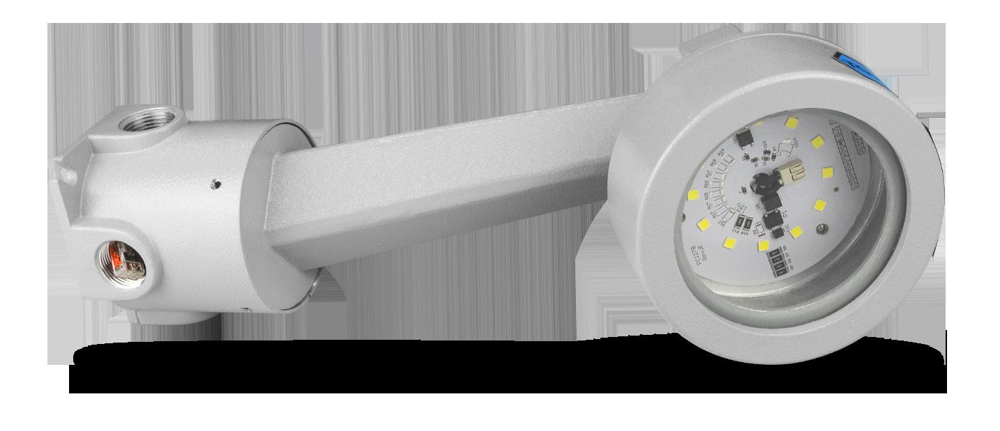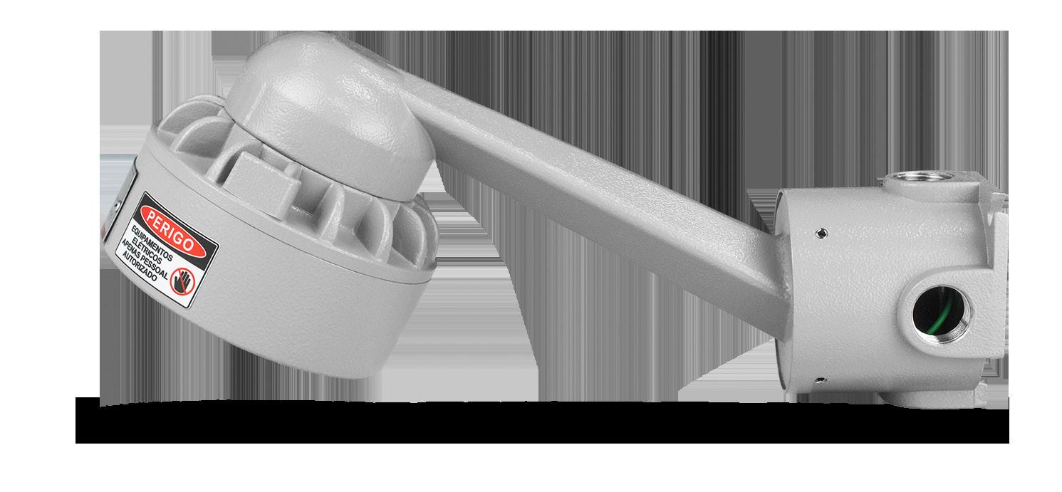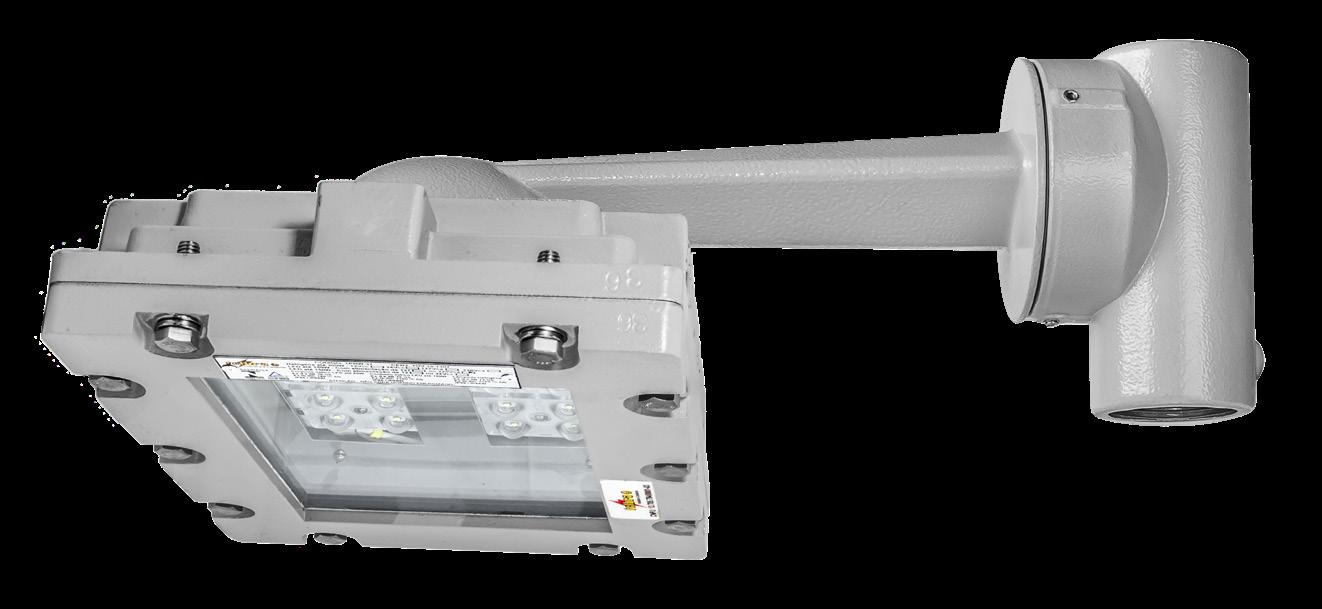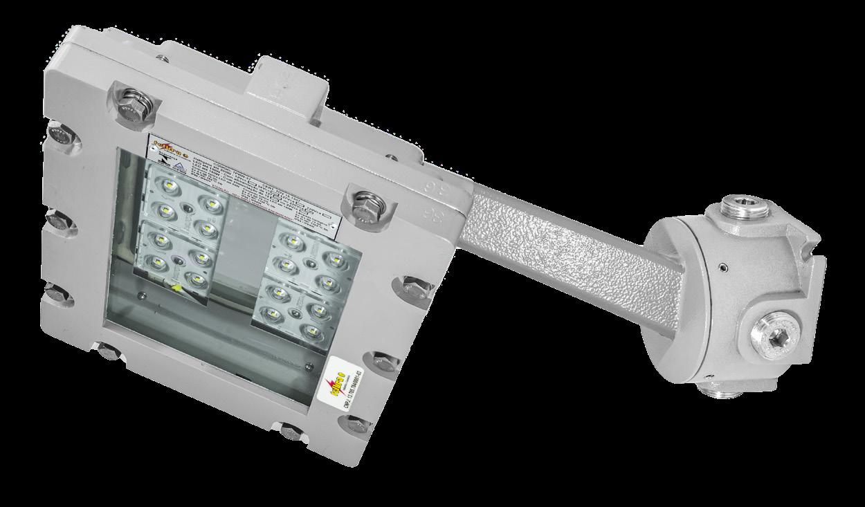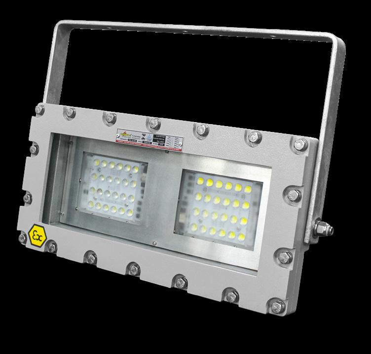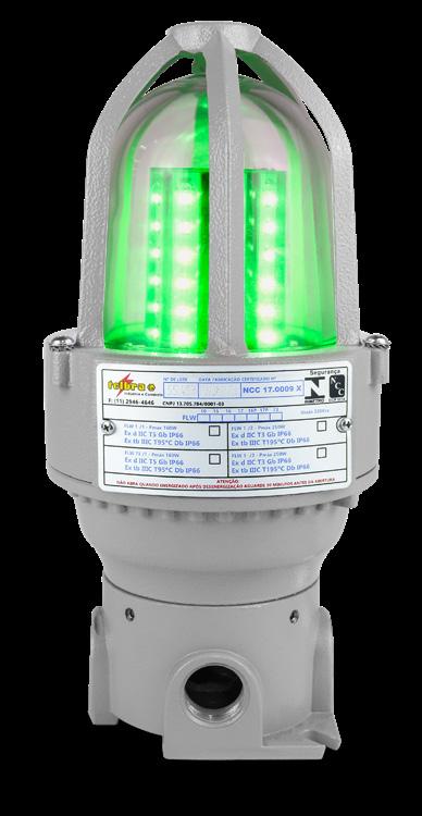 Luminária adequada para instalações em áreas classificadas com o tipo de proteção à prova de explosão Ex db e à prova de ingresso de poeiras Ex tb. Corpo fabricado em liga de alumínio fundido, de alta resistência mecânica e à corrosão, SAE 305 ou SAE 356. Vidro plano temperado, acabamento em pintura eletrostática texturizada na cor cinza claro Munsell N6.5.
