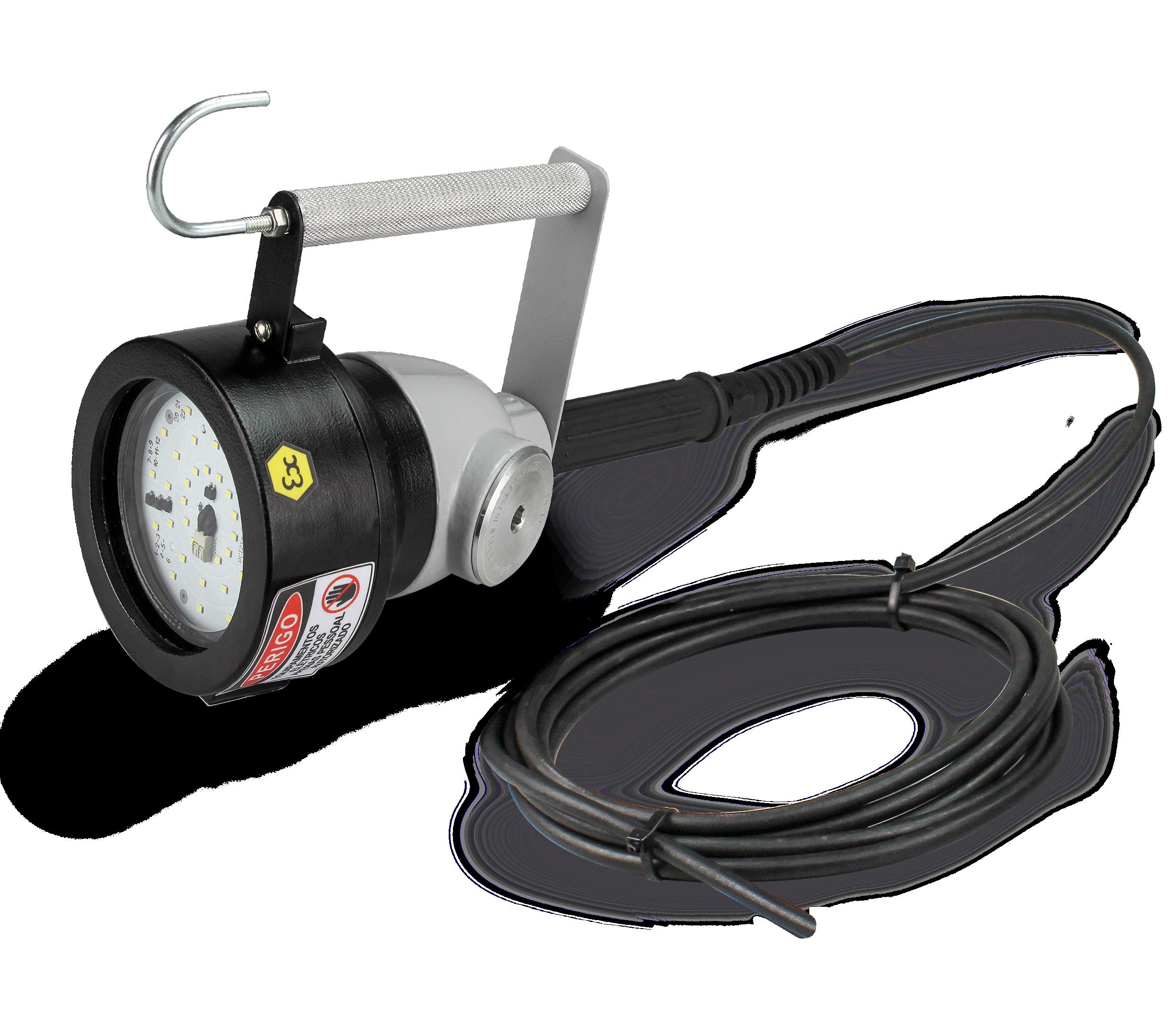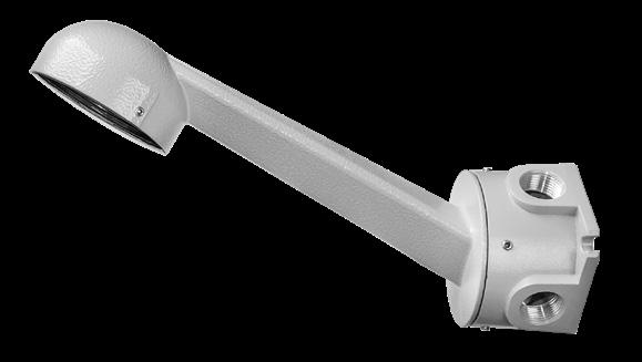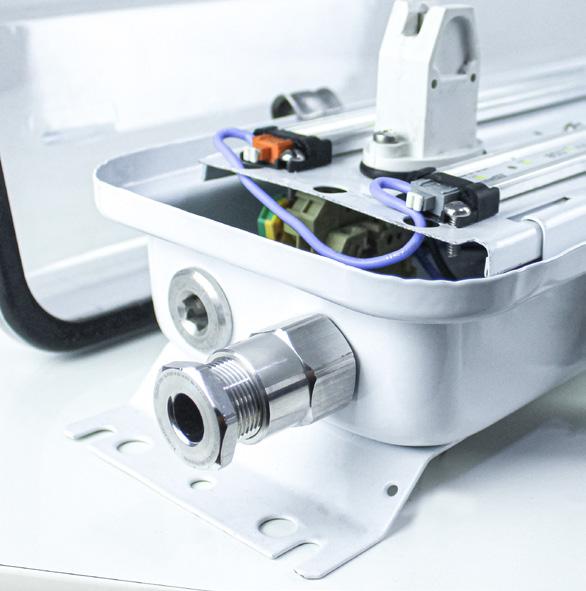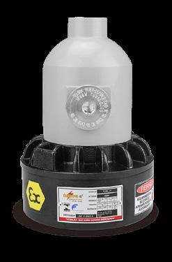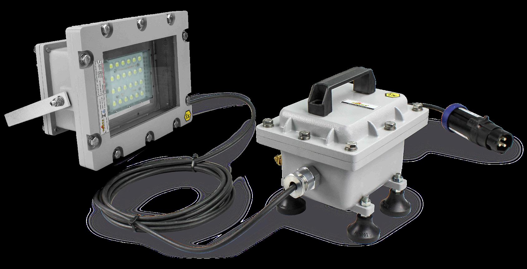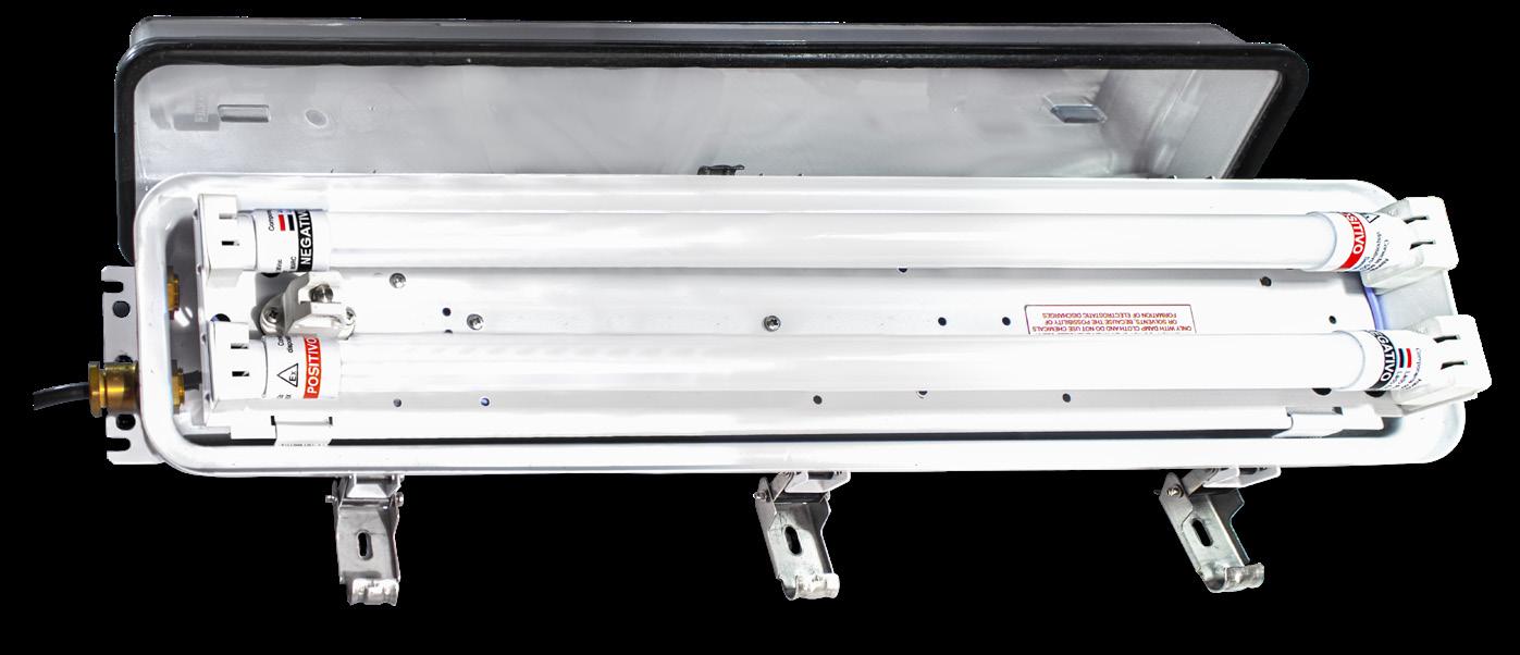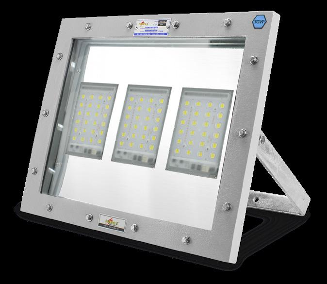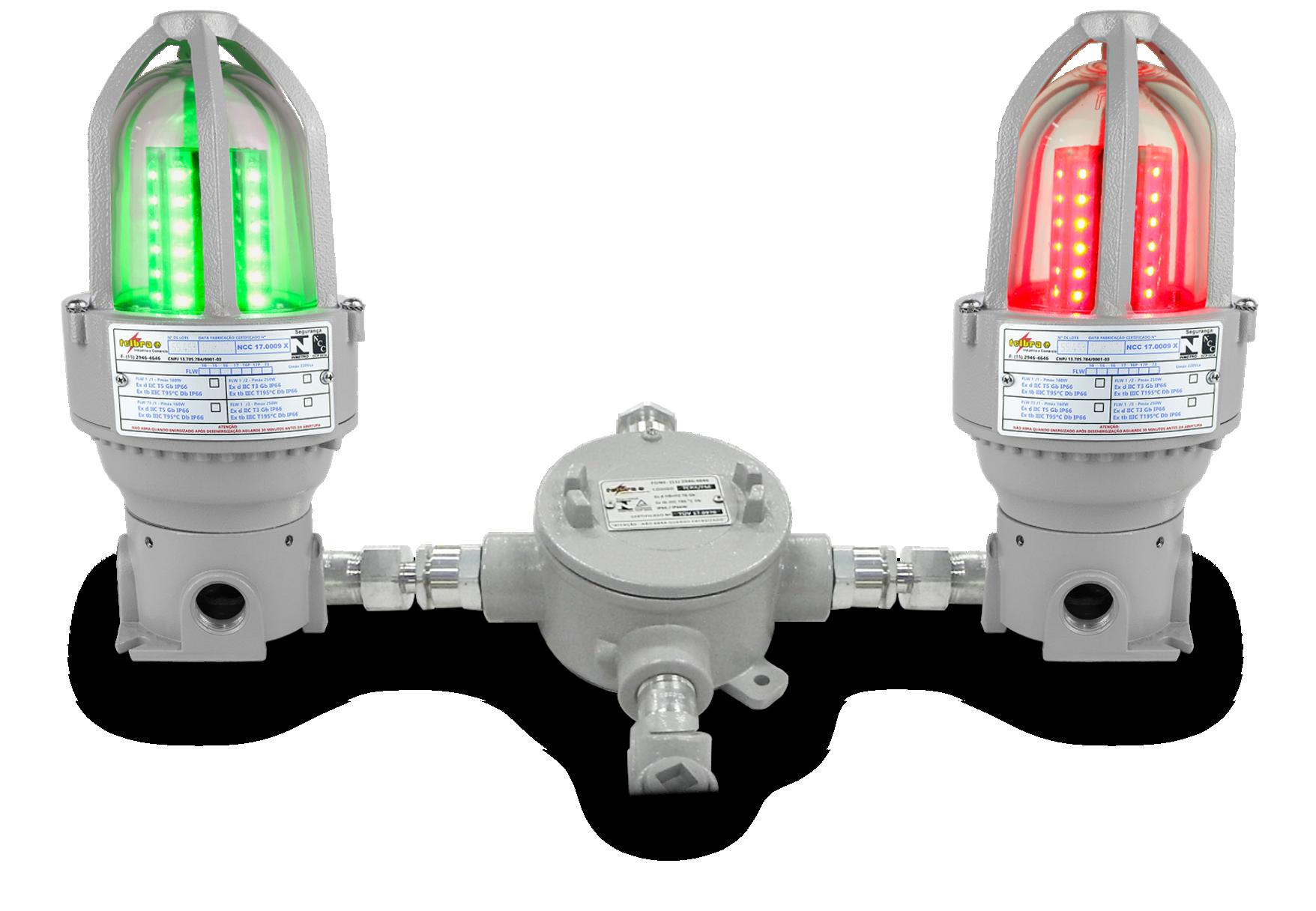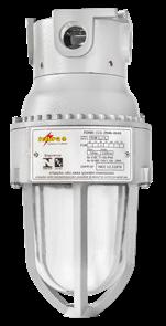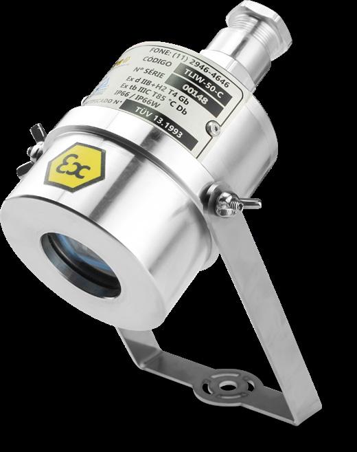 Luminária adequada para instalações em áreas classificadas com o tipo de proteção à prova de explosão Ex db e à prova de ingresso de poeiras Ex tb. Corpo fabricado em liga de alumínio fundido, de alta resistência mecânica e à corrosão, SAE 305 ou SAE 356. Vidro plano temperado, acabamento em pintura eletrostática texturizada na cor cinza claro Munsell N6.5.