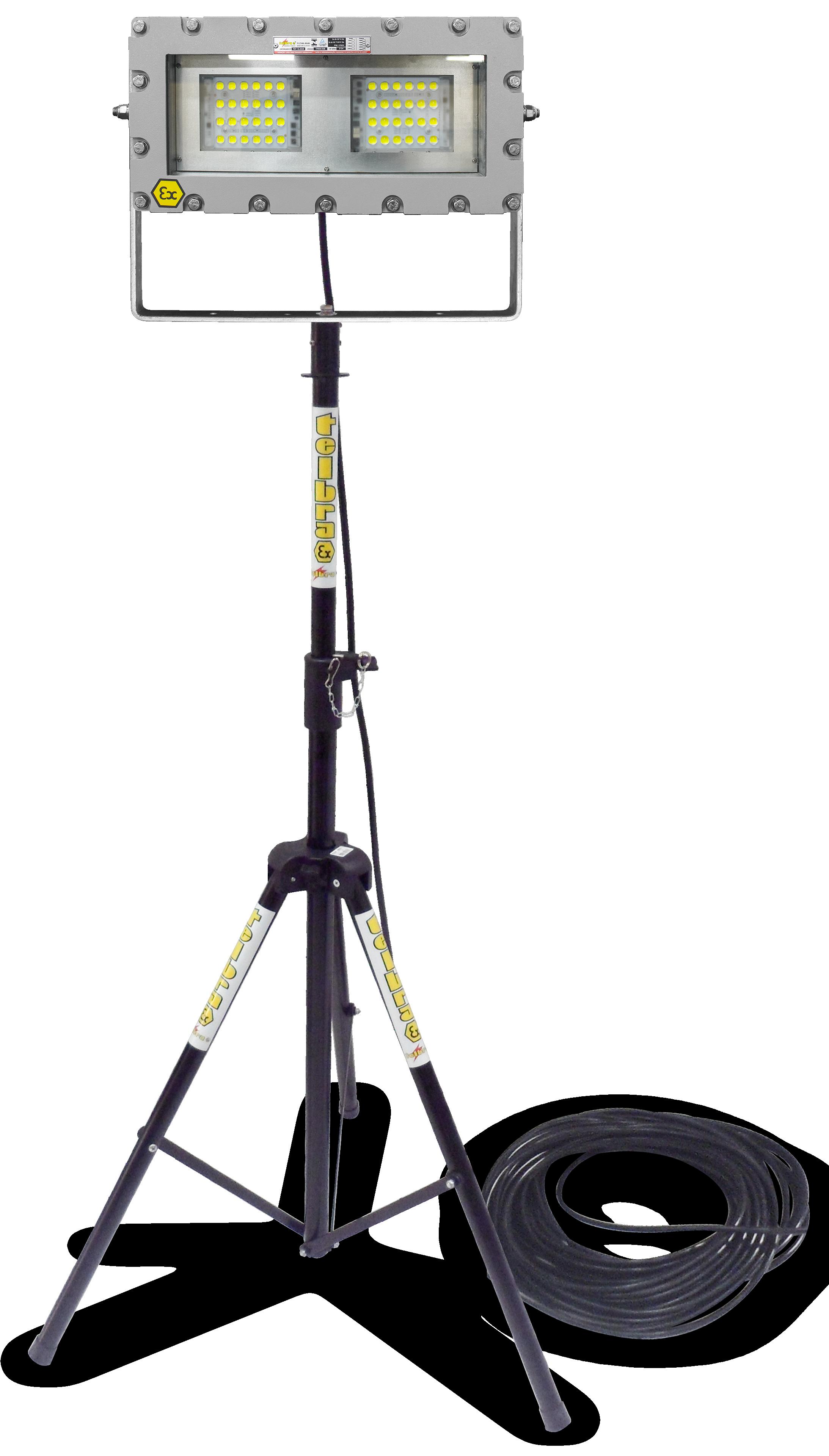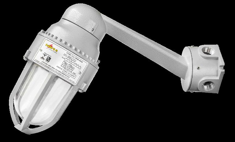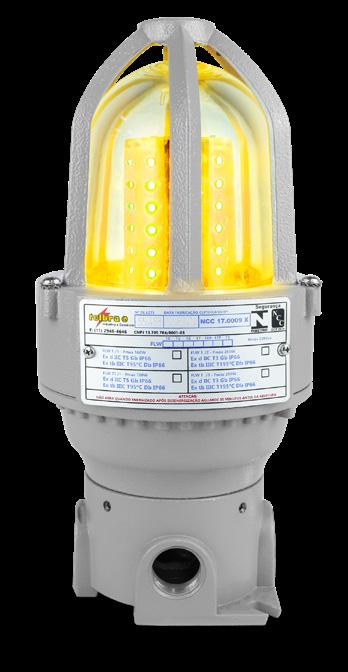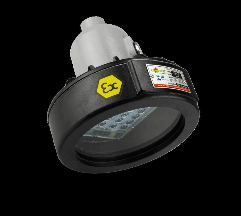 Luminária adequada para instalações em áreas classificadas com o tipo de proteção à prova de explosão Ex d e à prova de ingresso de poeiras Ex t. Corpo fabricado em liga de alumínio fundido, de alta resistência mecânica e à corrosão, SAE 305 ou SAE 356. Vidro plano temperado, acabamento em pintura eletrostática texturizada na cor amarela RAL 1021