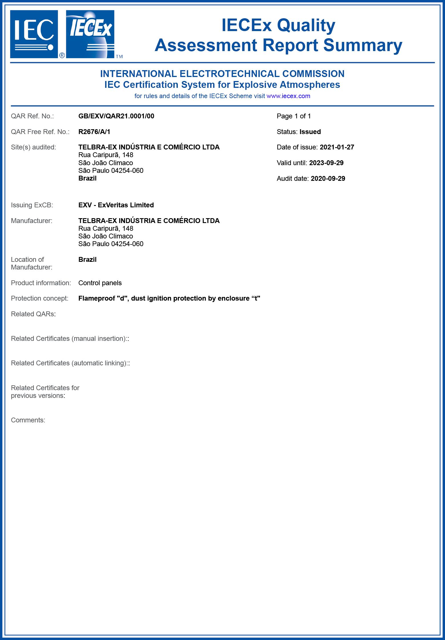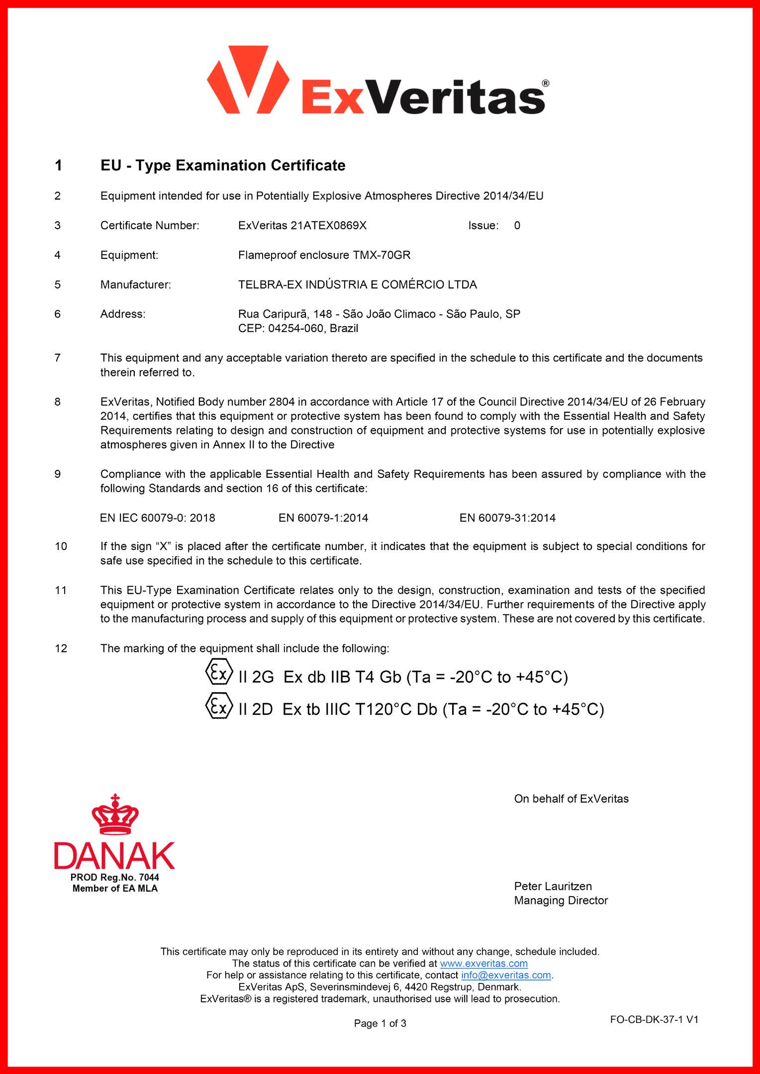 Certificado de conformidade para painéis elétricos tipo TMX-70GR com tipo de proteção Ex d