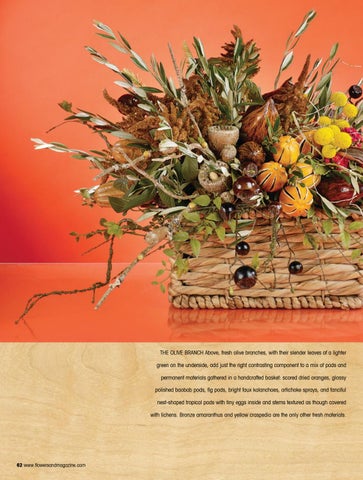THE OLIVE BRANCH Above, fresh olive branches, with their slender leaves of a lighter green on the underside, add just the right contrasting component to a mix of pods and permanent materials gathered in a handcrafted basket: scored dried oranges, glossy polished baobab pods, fig pods, bright faux kalanchoes, artichoke sprays, and fanciful nest-shaped tropical pods with tiny eggs inside and stems textured as though covered with lichens. Bronze amaranthus and yellow craspedia are the only other fresh materials.