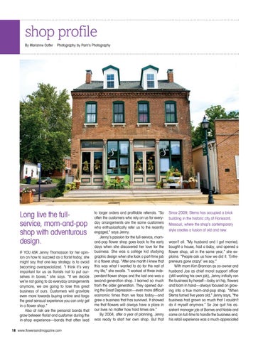 Long live the fullservice, mom-and-pop shop with adventurous design. IF YOU ASK Jenny Thomasson for her opinion on how to succeed as a florist today, she might say that one key strategy is to avoid becoming overspecialized. “I think it’s very important for us as florists not to put ourselves in boxes,” she says. “If we decide we’re not going to do everyday arrangements anymore, we are going to lose this great business of ours. Customers will gravitate even more towards buying online and forgo the great sensual experience you can only get in a flower shop.” Also at risk are the personal bonds that grow between florist and customer during the in-shop experience—bonds that often lead 18 www.flowersandmagazine.com