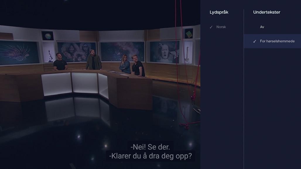 • Kontroller at programmet du ser på sendes i surround: Trykk pil opp for å vise Kanalbanner og velg ikonet over tidslinjen for å åpne vinduet for Lydspråk og Undertekster. Sjekk at lydspråket du har valgt er meket med -ikonet (Dolby Digital).