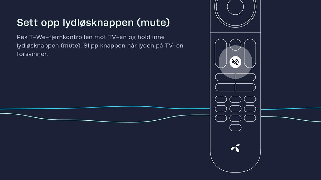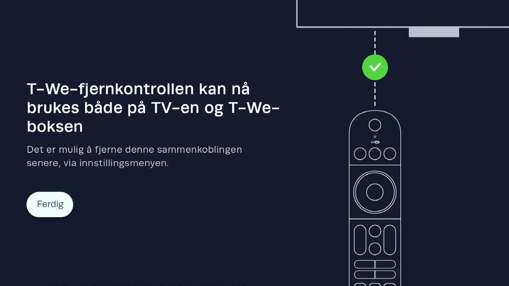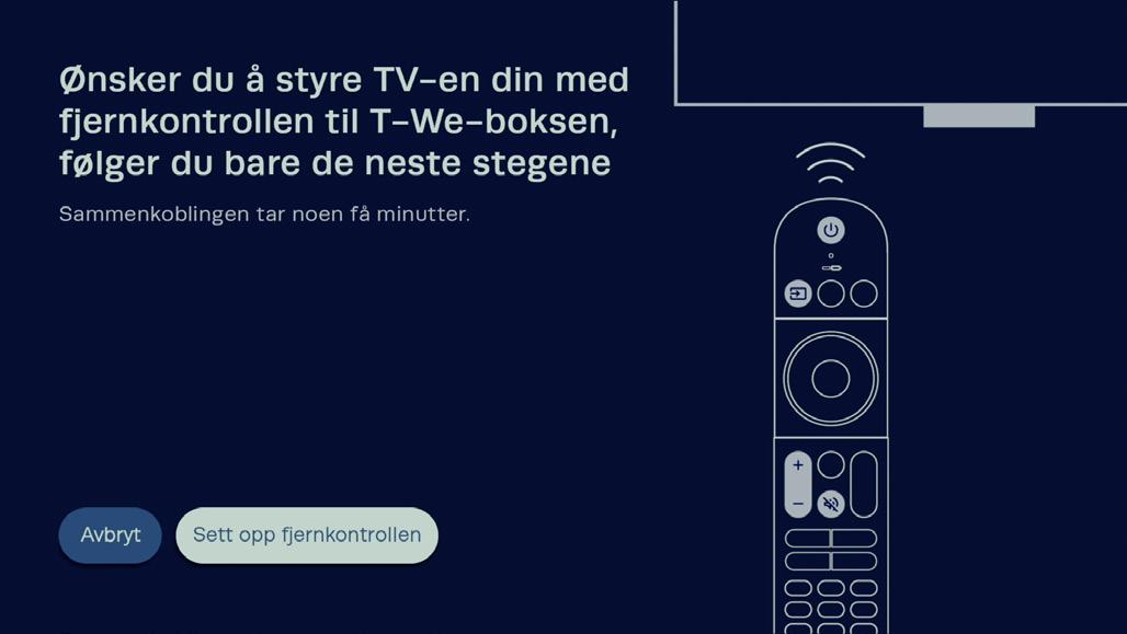Tips: Fjernkontrollen kan også settes opp til å slå på TV-en din samtidig med T-We-boksen i tillegg til å styre volum, mute og kildeinngang. Se side 34.