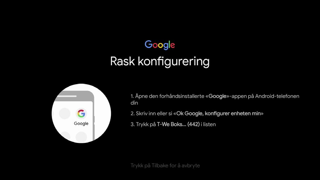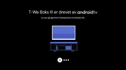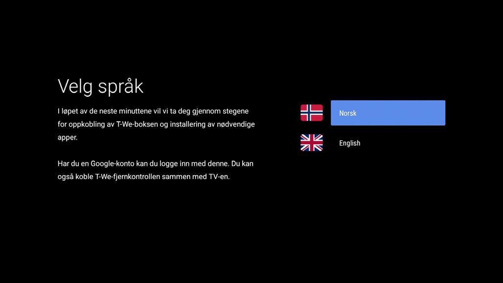 Koble til strøm på baksiden av T-We-boksen (se side 7) og slå på TV-en. Pass på at TV-en er stilt inn på den HDMI-inngangen du har koblet T-We-boksen til. T-We-boksen vil nå gå gjennom en oppstartsprosedyre og snart vil et av flere velkomstbilder vises.