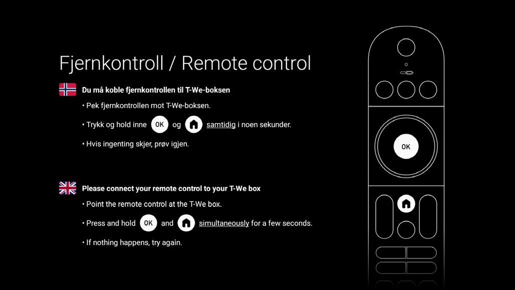 Første gangen du bruker fjernkontrollen må den koble seg til T-We Boks III. Når du ser dette bildet på TV-skjermen holder du inne og til det blå lyset (rett over -knappen) på fjernkontrollen tennes. Deretter slipper du knappene.