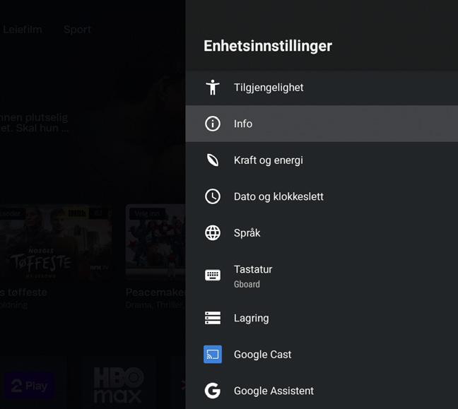 • Trykk på , gå til Innstillinger i menyen til venstre og deretter Systeminnstillinger, velg Enhetsinnstillinger og deretter Info.