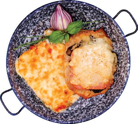 ÓVÁRI SERTÉSSZELET (GOMBÁVAL, SONKÁVAL, R. SAJTTAL), CSŐBEN SÜLT BROKKOLIVAL