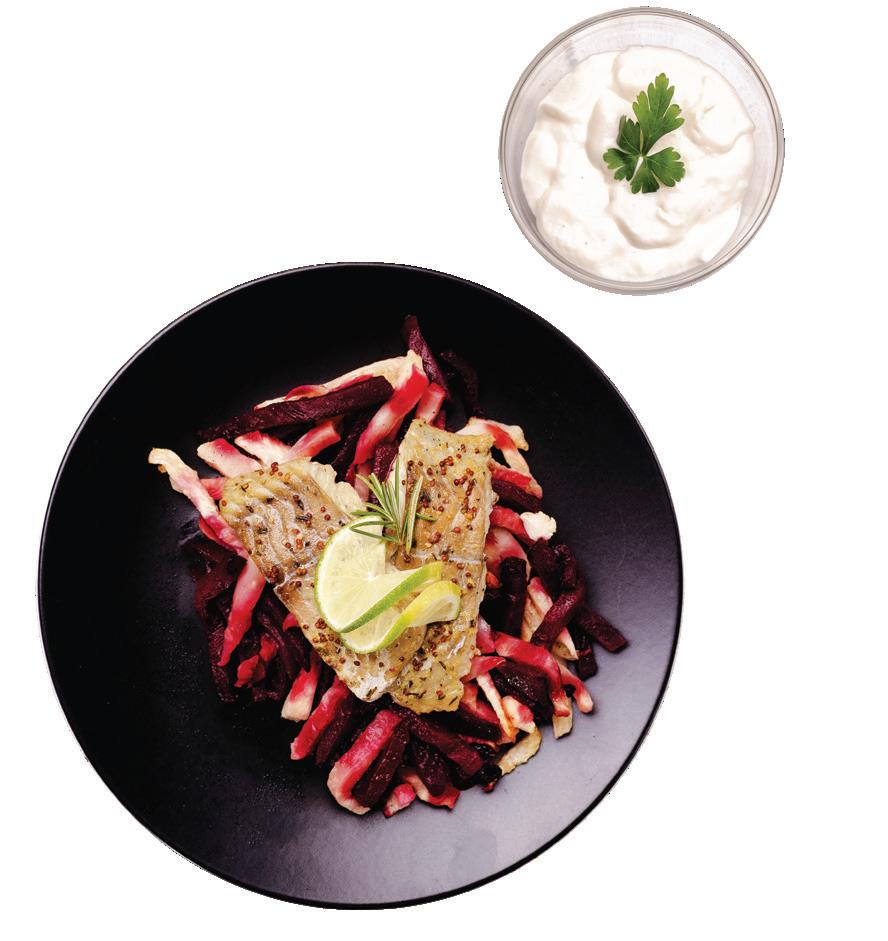 HABZÓ VAJON SÜLT FOGASFILÉ ZÖLDSÉGES TORTILLÁVAL, KORIANDERES LIME MÁRTÁSSAL