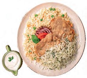 KARNEVÁLI RÁNTOTT BORDA (BURGONYÁS RÁNTOTT SERTÉSKARAJ, SNIDLINGES MOZZARELLA SAJTTAL, FOKHAGYMÁS TEJFÖLLEL), RIZI-KIZI-BIZI (ZÖLDBORSÓS, KUKORICÁS RIZS)