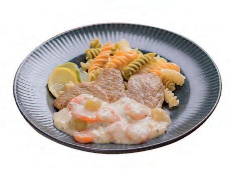SERTÉSTARJA VÖRÖSBOROS, ERDEI GOMBÁS RAGUVAL, ALMÁS BURGONYAKROKETTEL