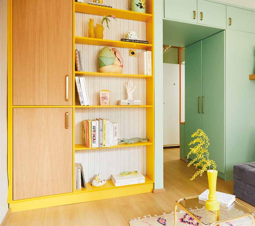 A színek sem a hétköznapi ízlést idézik: a konyha púderszínű csempéje, a falak jáde zöldje, a polcok sárgája az izgalmat kereső szemeknek valók; a tapéta vertikális csíkjai pedig megemelik a teret, a szűk tér kitágul, már nem is érezzük annyira beszorítva magunkat a négy fal közé.