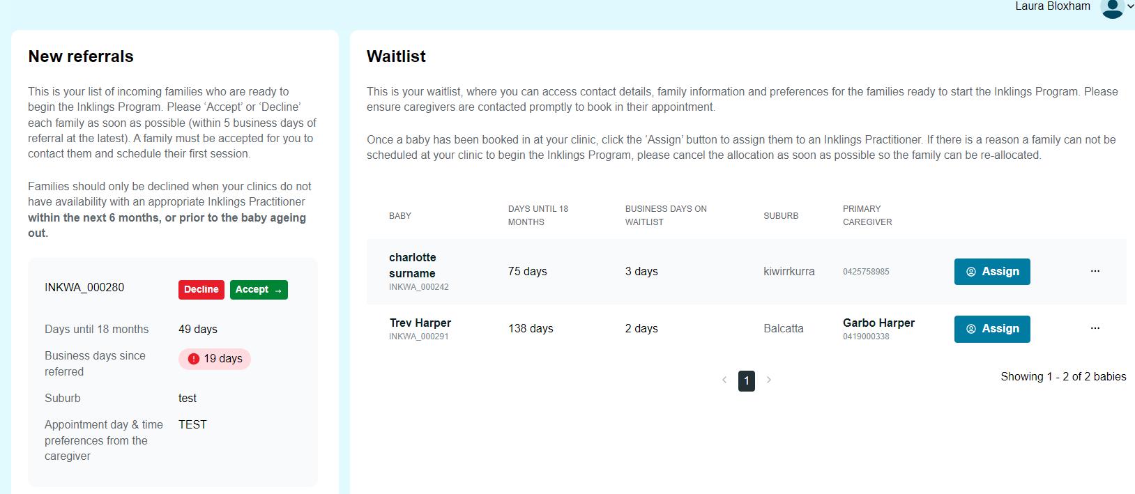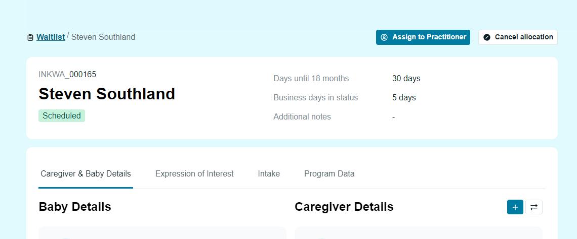 After contacting the Caregiver to book in their Inklings session, the baby will then be assigned to their Practitioner. This will allow the baby to appear on the Practitioner’s list of clients.
