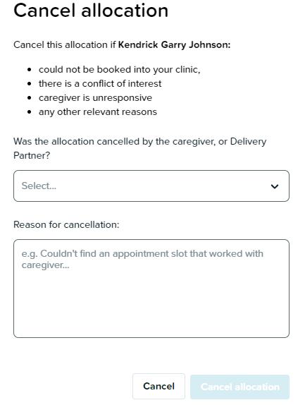 2. Select cancel allocation, identify who requested the cancellation, provide the reason and submit.
