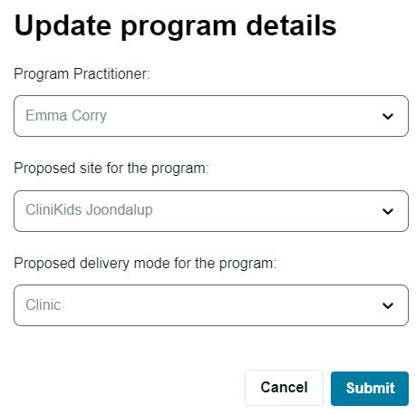 Selecting ‘Update program details’ from the drop-down menu will allow the user to change basic details of the program delivery. A modal will appear and details can be edited and submitted.