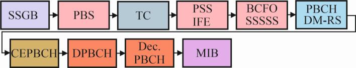 On Figure 1 we used the following notation where SSGB is the synchronization signal generation unit in burst form; PBS is the unit that provides a beam scan; TC is the transmission channel. We have also used the following notation for channel block blocks and correction blocks: PSS IFE is the primary synchronization signal and initial frequency estimate; BCFO SSSSS is the block for fine correction of frequency offset and secondary synchronization signal search system; PBCH DM-RS is the broadcast physical channel and demodulation reference signal; CE PBCH is the channel state estimation unit using a physical broadcasting channel. To designate the demodulation and decoding blocks, we used the following designations: DPBCH is the demodulation a physical broadcasting channel; Dec. PBCH is the decoding a physical broadcasting channel; MIB is the main information block.