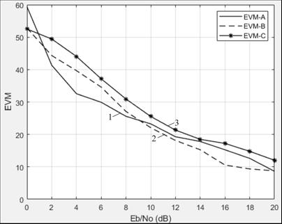 For the study, the channel models of the TDL-A, TDL-B and TDL-C types were used, which define the profiles for the structure of the channels without line of sight. The Doppler shift was determined from the formula ���� =|��|/��0 [25]. The dependence of EVM on SNR in PBCH for three different channel profiles without line of sight is shown in Figure 11.