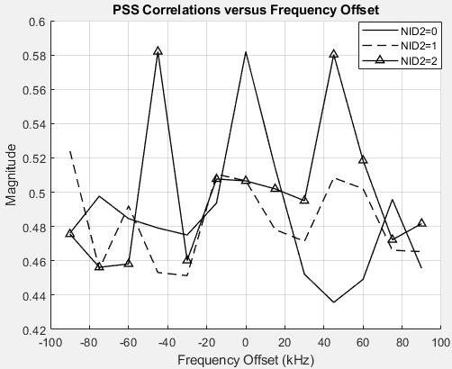 When comparing the obtained dependences of the PSS correlations on the frequency offset, the following conclusions can be drawn: for SNR = 15 dB, there is one peak of the strongest correlation for a frequency offset of 0 kHz with a spurious range of 0.044 and an average level of 0.125; for SNR = -12.5 dB, there are three peaks of the strongest correlation for frequency offsets of -45, 0, and 45 kHz, with spurious peak-to-peak values of 0.088 and an average of 0.48. This leads to an error in determining the cell identifier and the impossibility of establishing synchronization between the transmitter and the receiver. That is, outside of the synchronization setting area between the transmitter and the receiver, it becomes impossible to correctly determine the peak of the strongest correlation of the received waveform with each candidate PSS sequence.