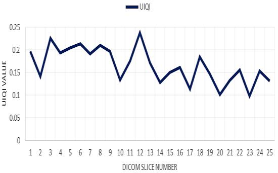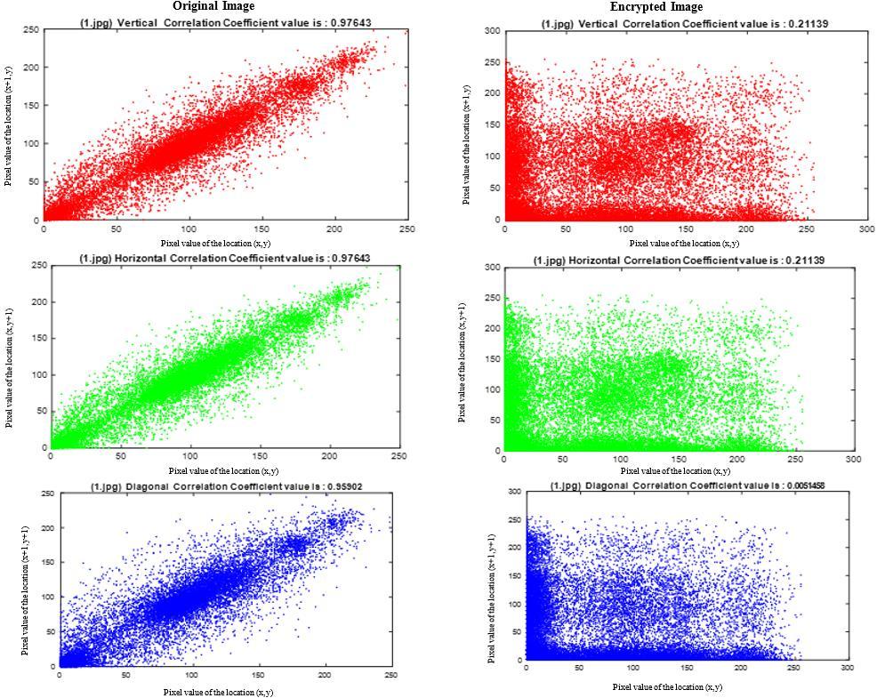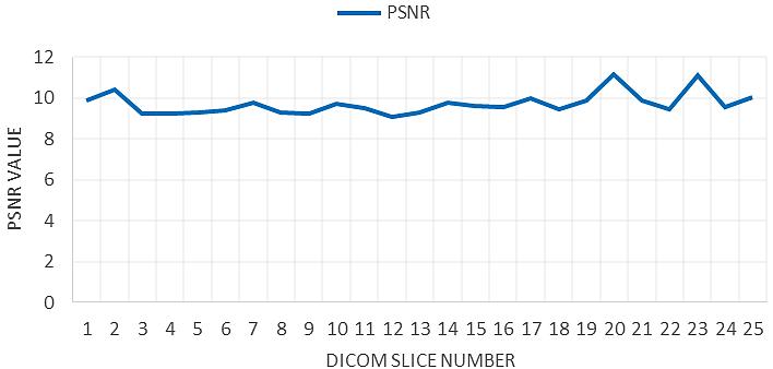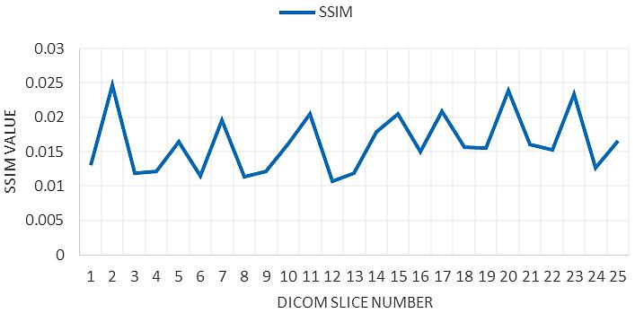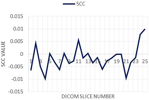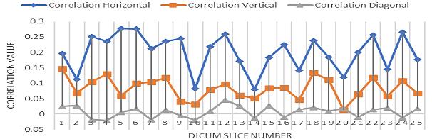 The correlation is tested in three direction horizontal, vertical, and diagonal Figure 13 explains a sample of one slice in DICOM image. Correlation coefficients: correlation coefficients measure the degree of linear dependence between two variables. A good encryption algorithm should have a low correlation coefficient between the original and encrypted images.