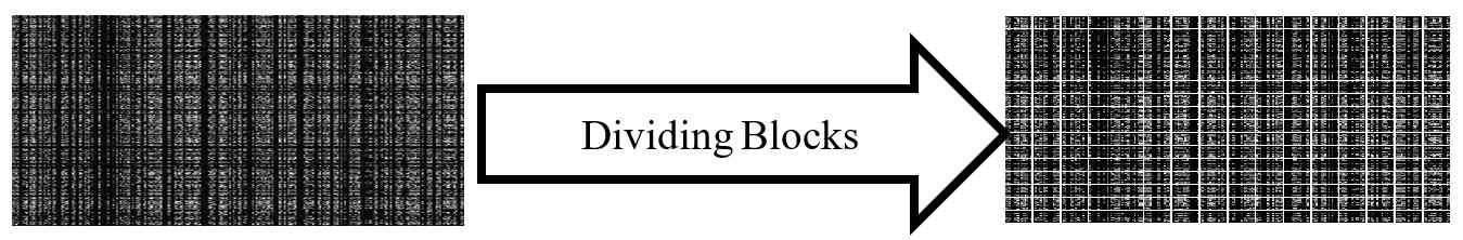 This step applied on all slices of DICOM by specifying the block size which will divide them. The process applied on horizontally such row of block one by one, each block will label and be a 3D matrix. The third dimension be the index of block as shown in Figure 4.
