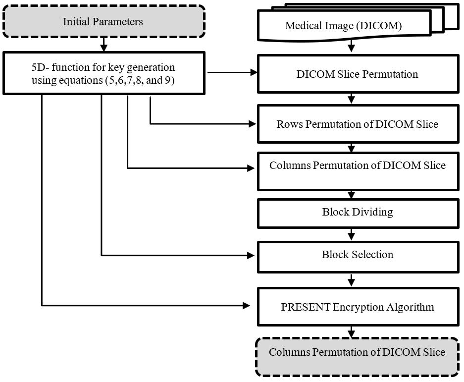 The key generation is used in all stages in proposed method, the five-dimension chaotic map are used to generate five sequences of numbers. The first sequence used in slices permutation, the second sequence used in row permutation, the third sequence used in columns permutation, the fourth sequence used for block selection, and the fifth dimension used as key of present encryption algorithm. It appears that the key generation process is an important part of the proposed algorithm, as it is used in all stages of the encryption process and helps to ensure that the encryption is both secure and efficient.