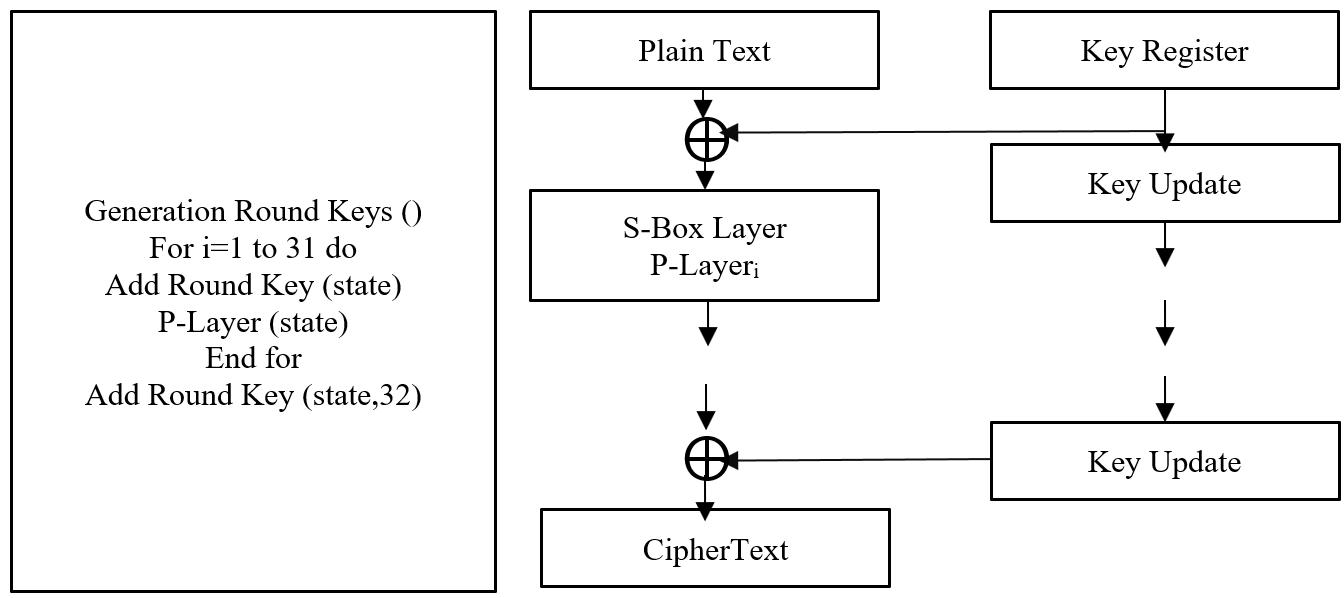 Present was designed by Bogdanov et al. [21] The encryption algorithm of present is a lightweight symmetric-key block cipher. It has a block length of 64 bit with a key length of 80-bit or 128-bit, and it uses the structure of substitution permutation network (SPN) [22], [23]. The algorithm has 31 rounds and the last round of key addition, as shown in Figure 6. The three functions that make up the round are as: add round key, substitution box layer, and permutation layer should all be included [24]
