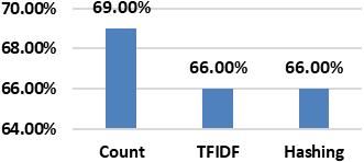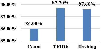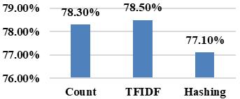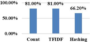 The comparative accuracy in the Figure 6, on average, the best vectorizer produced in the experiment is TFIDF, the second position is occupied by the count vectorizer and the last position is the hashing vectorizer. This, very in line with the way each method works, TFIDF can produce the best accuracy value because the basis for calculating TFIDF is to calculate every word frequency in each document, and this is certainly mathematically more relevant in finding the connection between words in class labels. Compared to just counting the frequency of words as the count vectorizer does. For hashing vectorizer, the calculation has a different way, namely by adding a hash value to each word feature. The result of the lowest hashing calculation in the experiment could be because of this, in addition to word processing, the use of hashing vectorizer is very rarely applied as a vectorizer.