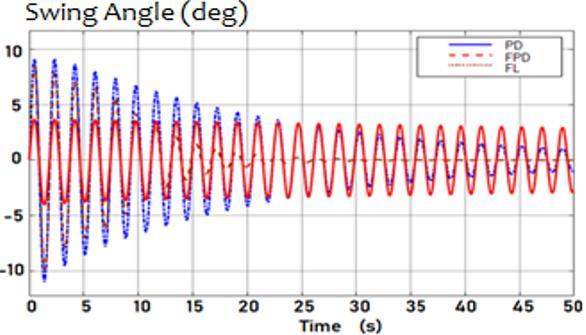 As it can be seen from the results that the use of conventional PD controller and fuzzy-tuned PD controller produces oscillation with amplitude of 20° and 18.25° respectively, compared to the fuzzy logic controller of about 6.06°. Although the position of the load follows the reference input, the oscillation of the sway angle requires treatment when using such model-dependent controllers that needs to update its parameters (���� and ����) with any change in tower crane dynamics. One of the reasons for using fuzzy logic to control a tower crane is its ability to control both the payload position and the swing angle without the need for an accurate mathematical model of the crane.