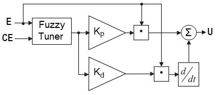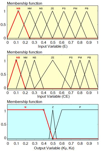 Several attempts have proposed new methods for self-tuning of PID controller parameters based on the mathematical model of the crane and others using intelligent algorithms. In this paper, a fuzzy tuner was used to adjust the parameters of the PD controller according to the error (E) and error change (CE), as shown in Figure 4. Two inputs have been applied to the fuzzy tuner; the error, calculated by comparing the reference input with the actual output, and the CE. The input variables (E and CE) are represented by seven fuzzy sets, while the output variables (���� and ����) are represented by three fuzzy sets, as shown in Figure 5. There are 49 fuzzy rules, as given in Table 1, used by the fuzzy inference engine to determine the updated values of controller parameters. The simulation of the tower crane and the fuzzy-tuned PD controller is given in Figure 6.