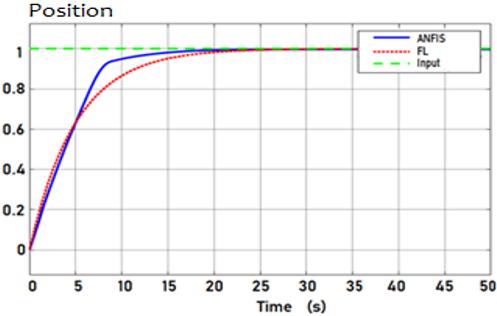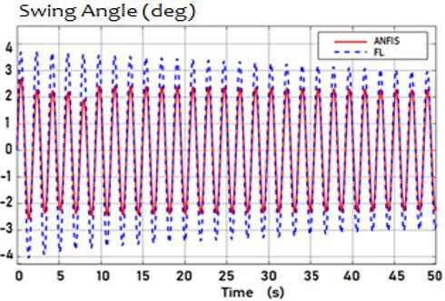 The performance of the ANFIS controller has been compared with other controllers in terms of response time specifications including; delay time, rise time, settling time, steady-state error, and maximum overshoot. The time response of the system using PD, fuzzy-tuned PD, and fuzzy controllers for position is given in Figure 11(a), and for swing angle in Figure 11(b). When using an ANFIS-based controller, there was a clear improvement in the behavior of the system compared to the fuzzy controller, as given in Figure 12. Where Figure 12(a) shows the time response of the position, and Figure 12(b) for the swing angle. Referring to Table 3, the results show that the conventional PD controller achieved a stable response with a delay time of 1.298 seconds, a rise time of 4.148 seconds, a settling time of 10.567 seconds, and a maximumovershoot of0.2%.