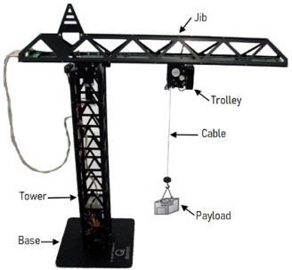 A real tower crane is a complex structure that includes the base, mast, boom, balance beams, trolley and control systems. In this paper, an educational crane of type “Quanser 3 DOF” was used, as shown in Figure 1. It is a compact version of the tower crane, as illustrated in Figure 1(a), has three degrees of freedom; the tower rotates in both directions, the trolley moves along the horizontal segment, and the height of the load can be changed. The jib rotates clockwise and counterclockwise and has a trolley moving along the jib using a motor. The trolley has a cable to lift the load up or down using another motor. Three motors are driven by electronic drive units and optical sensors to measure position and speed [25]. There are many ways to obtain a mathematical model of a tower crane, including the use of finite element analysis and Lagrangian methods [1], [26]. In order to obtain an accurate dynamic model representing the tower crane systems, several parameters have to be included when deriving the mathematical model. Such a model is a set of nonlinear equations, and it is difficult to use it for controller design or for performance analysis because the computation would be too complex. In fact, several assumptions are made to simplify the obtained model. For example, some mathematical models have included sensors and actuators, while some studies and research do not. In general, the mathematical model of tower crane appears nonlinear. Thus, it is easier to implement linearization to get an approximate linear model