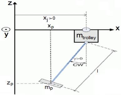 The jib is modeled as a two-dimensional linear gantry by assuming the payload is at a fixed height and is fixed about the gimble angle (��), and the movement is perpendicular to the jib length. In other words, it is assumed the payload rotates only about gimble angle (ɤ). The mathematical model of the tower crane is a nonlinear system, so the Lagrange method is used to find the nonlinear dynamics of the crane. The following equations are used to obtain the state space matrices [25].