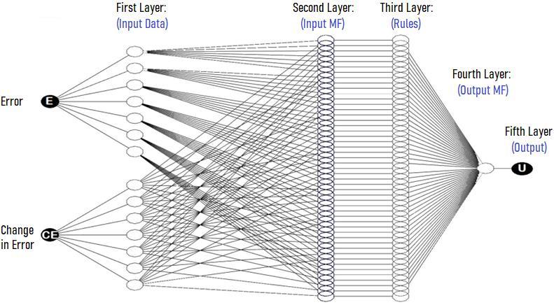 The proposed ANFIS controller is used to create an input-output mapping based on a set of fuzzy if-then rules and input-output data pairs to control both the position (��0) and swing angle (ɤ). It combines the ability of rule-based fuzzy controller and the learning ability of a neural network to improve the membership functions of fuzzy sets. The ANFIS model architecture, as shown in Figure 9, consists of two parts; the condition part and the conclusion part, which are linked to each other by rules in the form of a multi-layer neural network. The first layer has 14 nodes to execute the fuzzification process. The second layer has 49 nodes to implement the fuzzy and operation of the condition part of the fuzzy rules. The third layer has 49 nodes to normalize the membership functions. The fourth layer is a single node that executes the conclusion part of the fuzzy rules, and finally the fifth layer is a single node to compute the output of fuzzy system by summing up the outputs of previous layer. Figure 9 outlines the main six steps of the implemented ANFIS controller