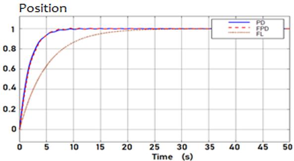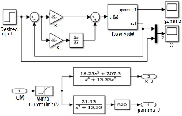 The conventional PID controller is one of the most widely used linear control technologies in crane control systems. The main problem of this controller is the continuous updating of its parameters, which are mainly based on the mathematical model of the crane. The parameters of the PID controller can also be updated using intelligent algorithms that do not depend entirely on the mathematical model of the crane. For the mathematical model obtained for the tower crane used in this research, the PD controller is sufficient to meet the required control requirements. Figure 3 shows a simulation of both the tower crane and the PD controller model. The parameter values for ���� and ���� of the controller were well chosen to obtain the best response. The main disadvantage of this controller is the real-time tuning of the parameters of the controller that depends on the dynamics of the crane.