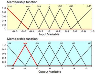 A fuzzy logic controller (FLC) has been used to compute the required actuating signal (U) according to the error and error change. Figure 7 shows fuzzy set controller elements in Figure 7(a) and input and output variables in Figure 7(b). Each variable is coded by seven fuzzy sets; large negative (LN), medium negative (MN), small negative (SN), zero (Z), small positive (SP), medium positive (MP), and large positive (LP), as shown in Figure 8. The implemented fuzzy controller is in fact a collection of 49 linguistic rules, as given in Table 2, which describe the relationships between inputs (E and CE), and output (U). The Mamdani style inference was used, as well as the center-of-gravity defuzzification method to convert the fuzzy output into a crisp value.