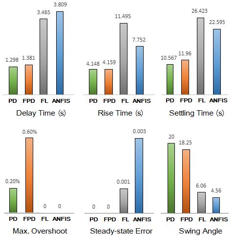 It can be seen from the previous results that the ANFIS-based controller is able to give a faster response compared to the fuzzy controller with rise time of 7.752 seconds, settling time of 22.595 seconds, minimum steady-state error and no overshoot. It is clear from the results that the swing angle fluctuation ranges from 2.28° to +2.28° for ANFIS controller, which is the lowest compared to other controllers. The main advantages of the proposed ANFIS controller are its ability to control both the payload position and swing angle as well as a model-independent approach that does not need to update its parameters depending on the dynamics of the tower crane. Figure 13 shows a comparison of the main indicators of the performance of the four controllers. These indicators show that the proposed ANFIS controller has the best performance and has better response compared to other controllers. Although the values of delay time, rise time and settling time are higher than the PD controller and the fuzzy-tuned PD controller, the swing angle fluctuations are less compared to other controllers, making it the best controller to control the position and swing angle of the crane.